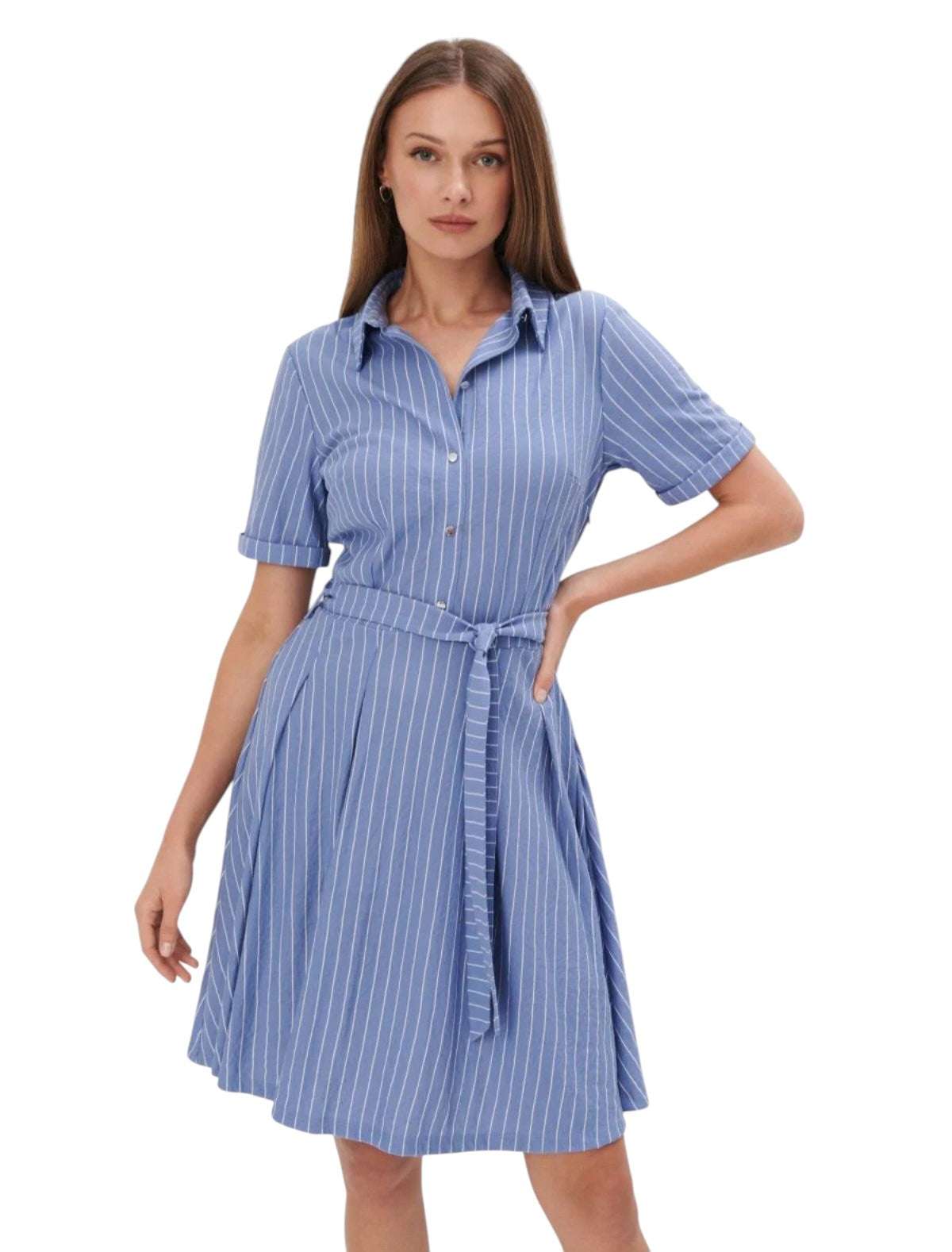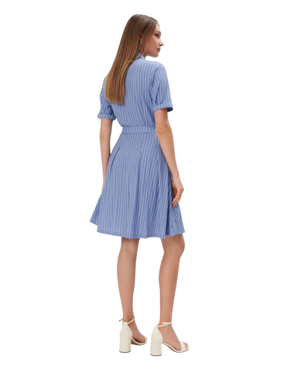 Címke nélküli, kék, fehér csíkos, rövid ujjú, galléros, gombos, megkötős derék, A-vonalú ingruha