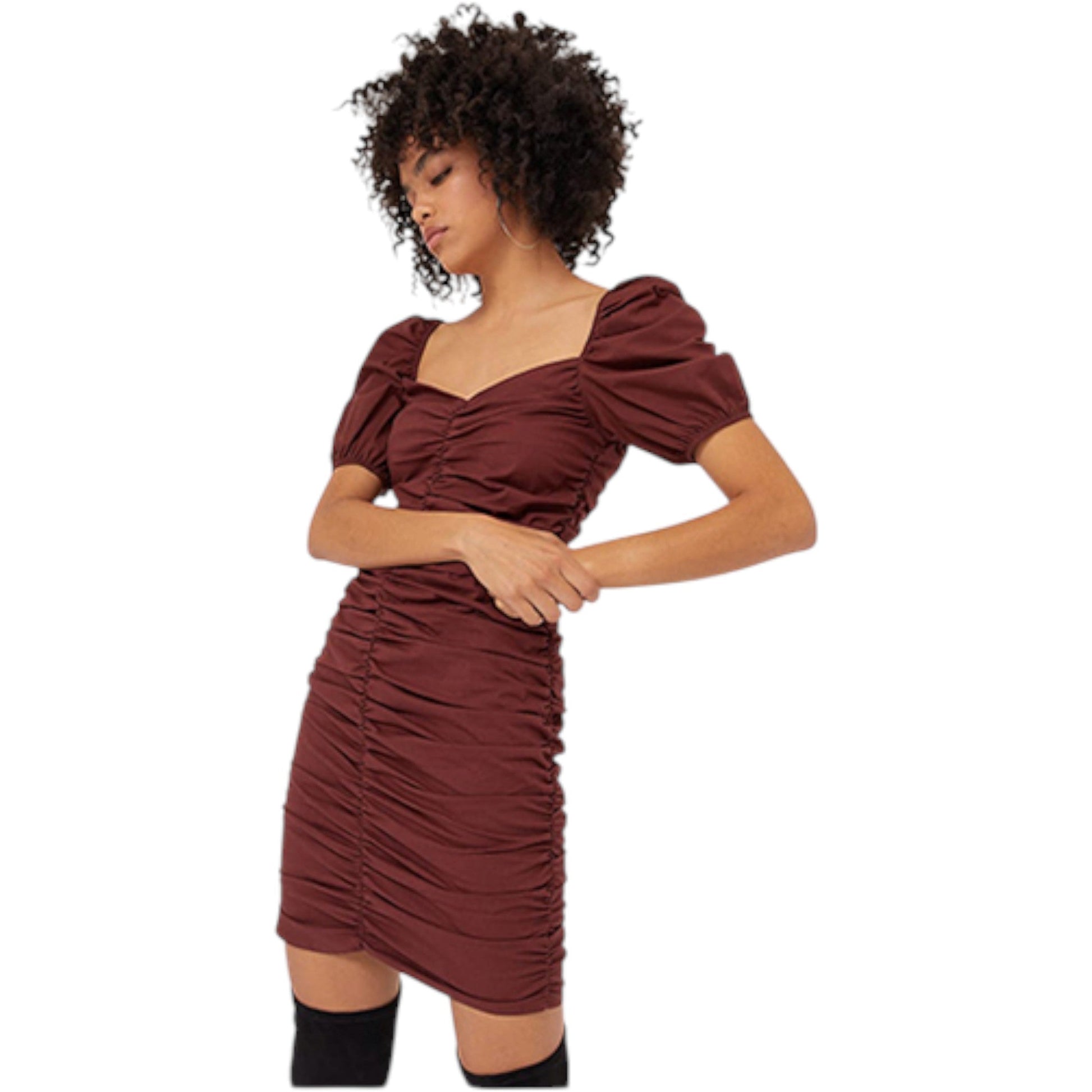 Címke nélküli, bordó, rövid puffos ujjú, szív alakú dekoltázsú, fűzős hatású, rátétes/ráncolt (ruching) miniruha.