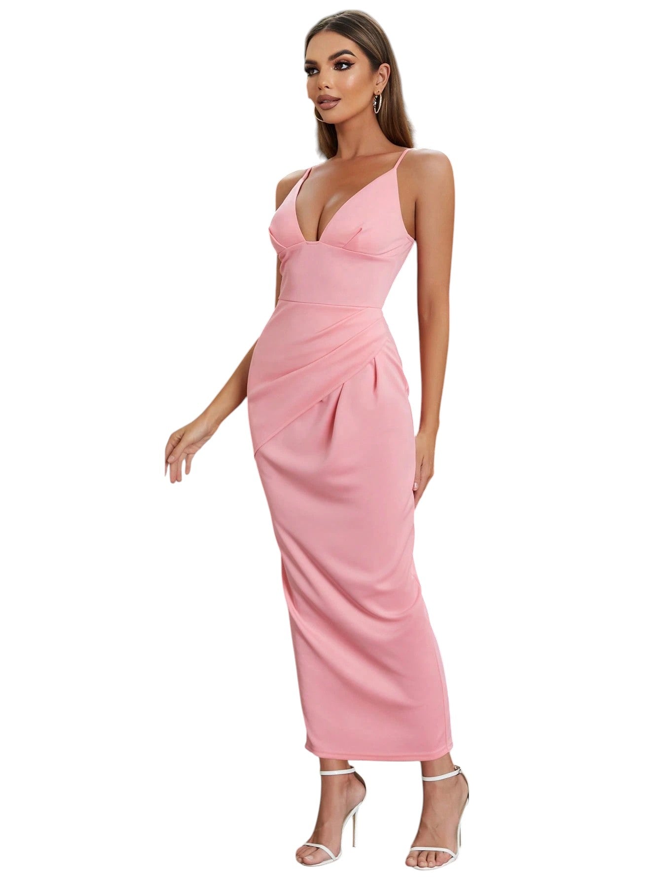 Címke nélküli, rózsaszín, mély V-nyakú, ujjatlan, ráncolt, testhezálló alkalmi ruha