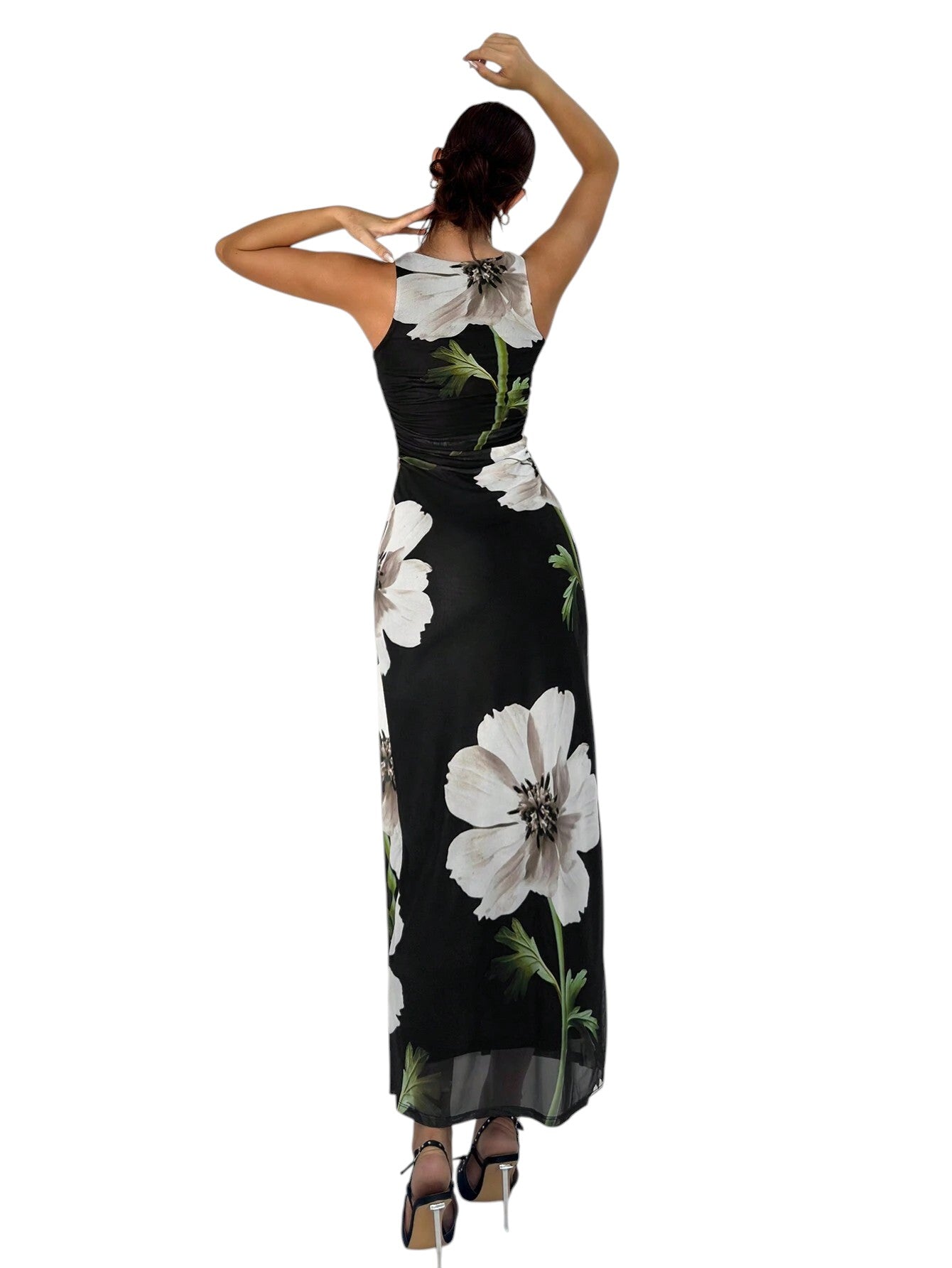 Címke nélküli, fekete alapon fehér és szürke virágmintás, kerek nyakú, ujjatlan, testhezálló maxi ruha