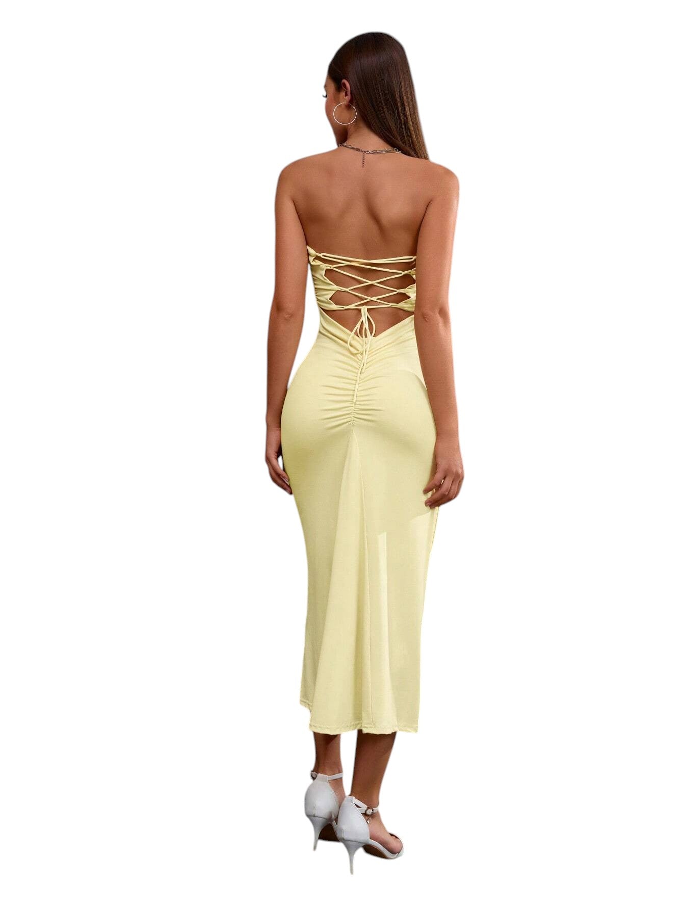 Címke nélküli, világossárga, pánt nélküli, testhezálló midi ruha