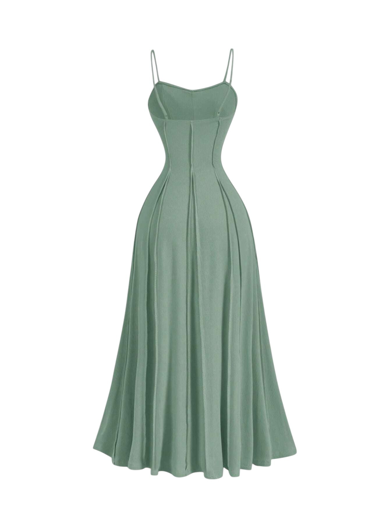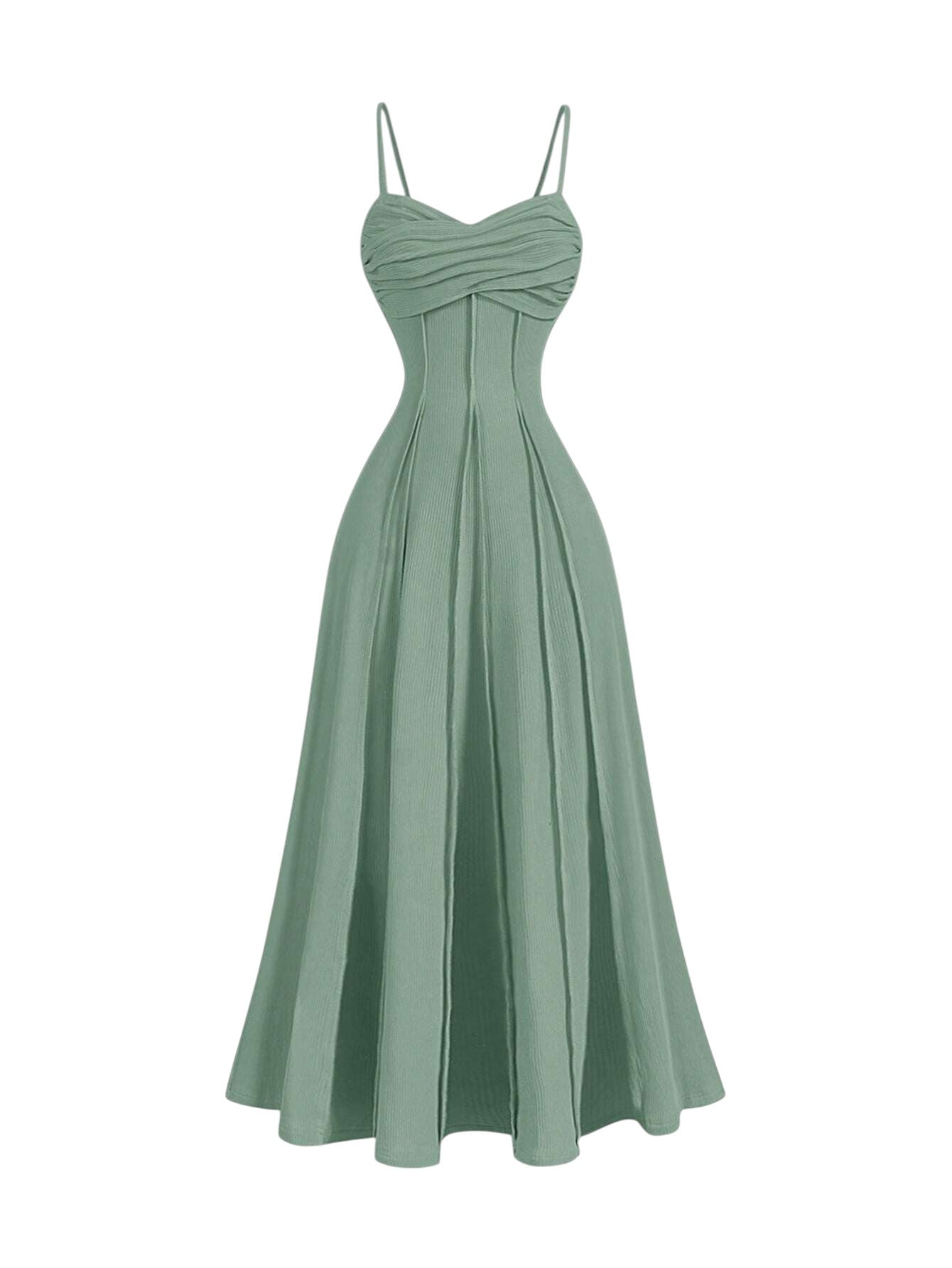 Címke nélküli, világoszöld, vékony pántos, ráncolt mellrészű, pliszírozott, A-vonalú midi ruha