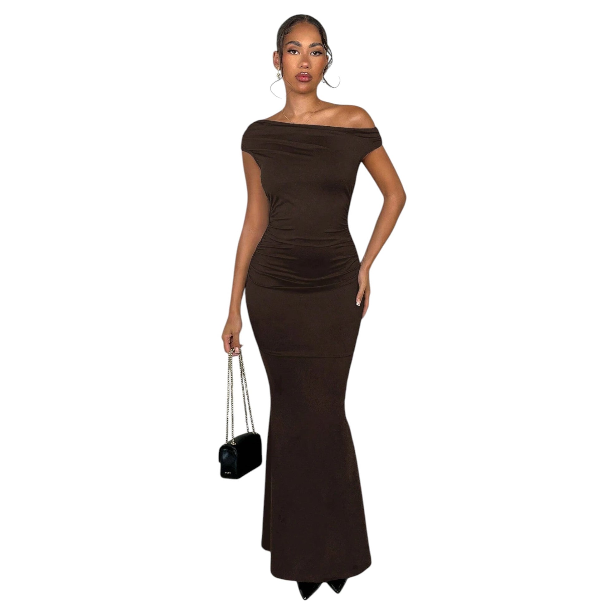 Címke nélküli, barna, aszimmetrikus nyakú, bodycon, maxi ruha, oldalt húzott.