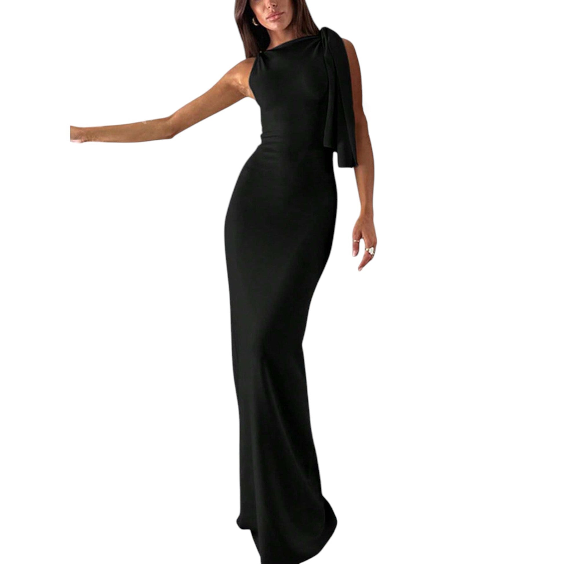 Címke nélküli, fekete, ujjatlan, garbó nyakú, oldalt megkötős, slim fit maxi ruha.