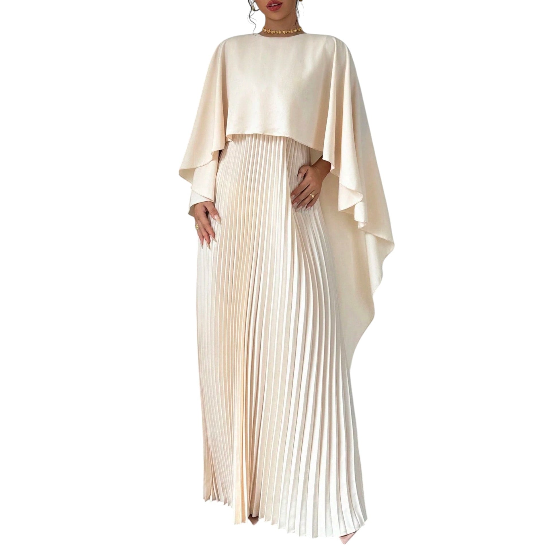 Címke nélküli, bézs, plisírozott, hosszú ujjú, kerek nyakú maxi ruha rávarrt köpennyel.