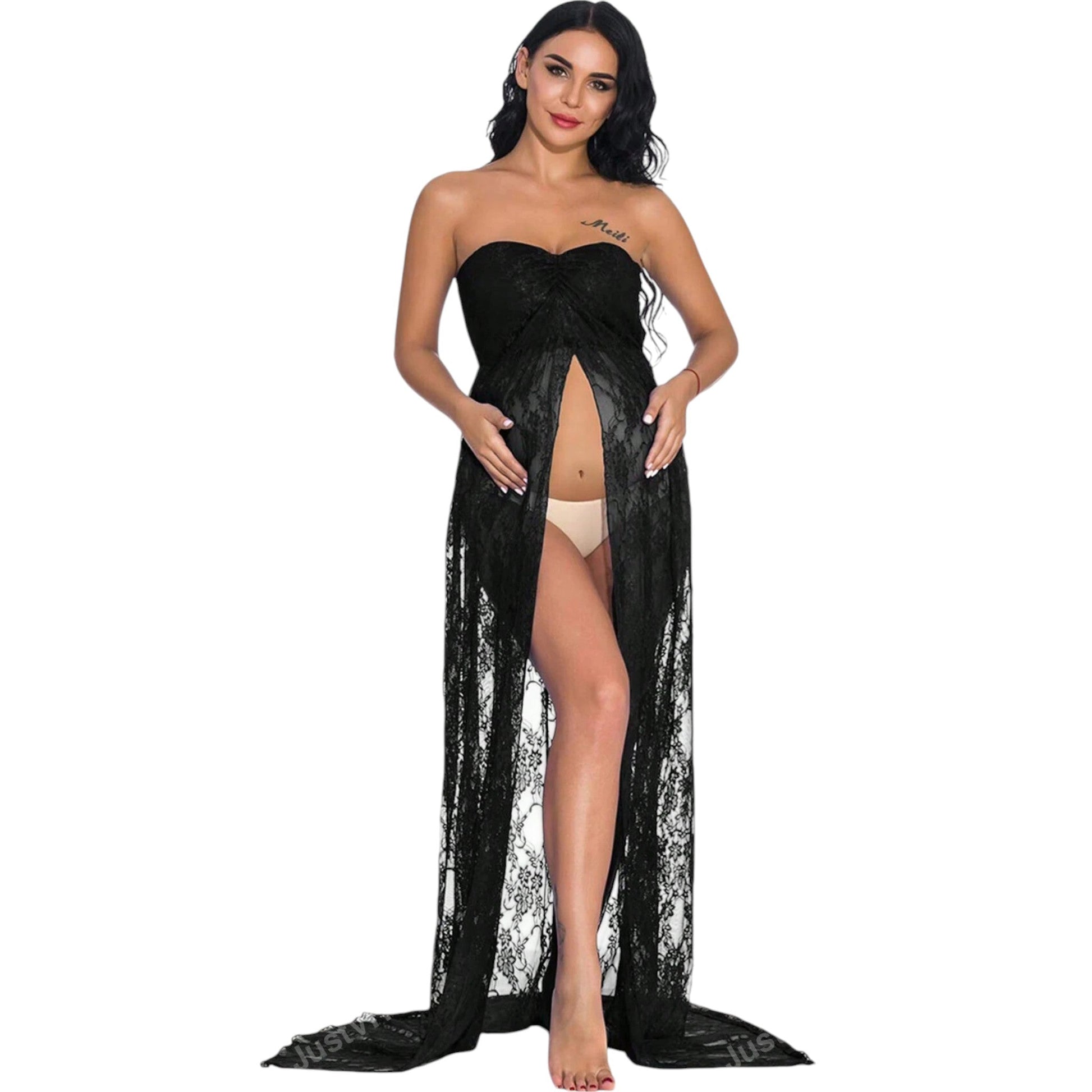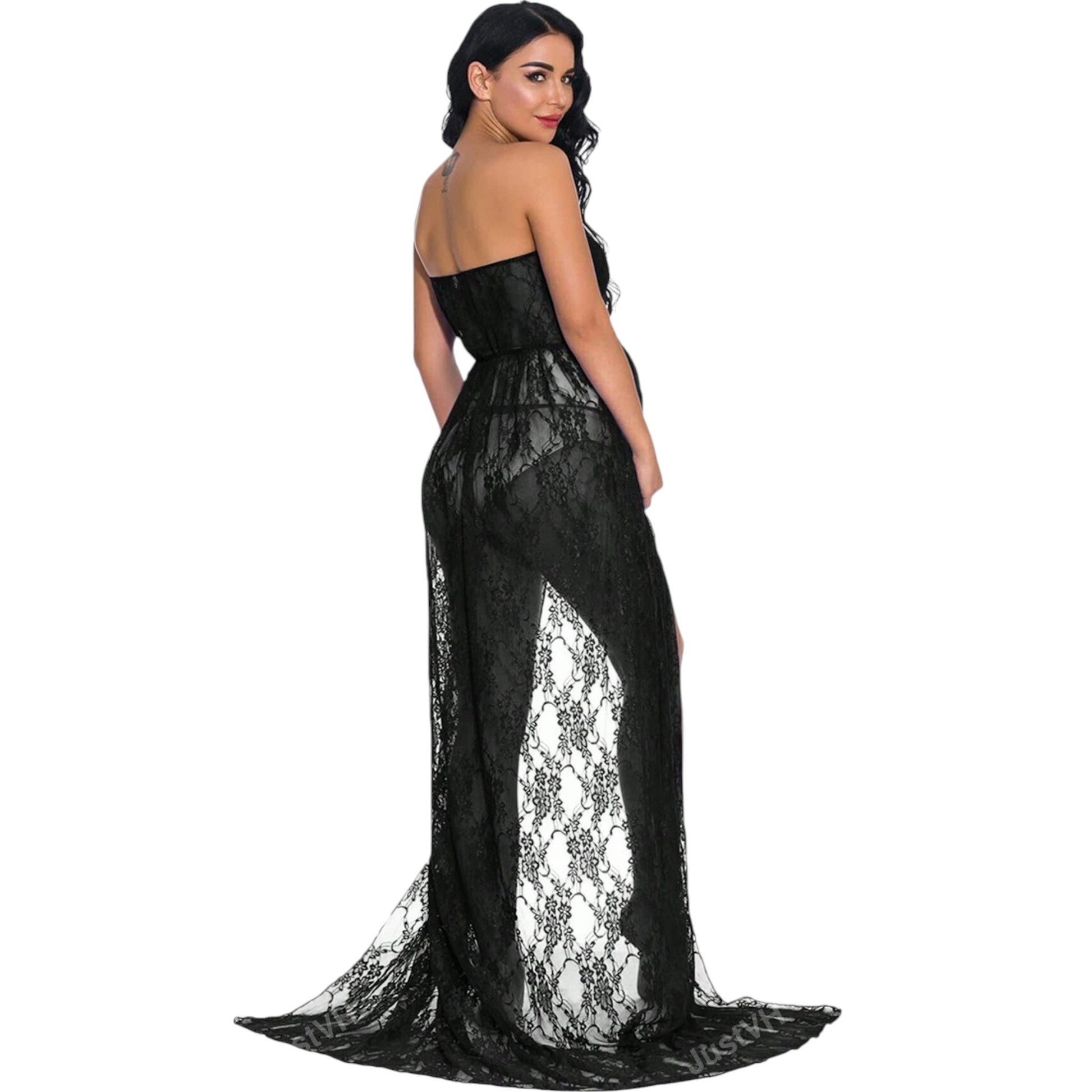 Címke nélküli, fekete, pánt nélküli, csipke maxi ruha hasítékkal.