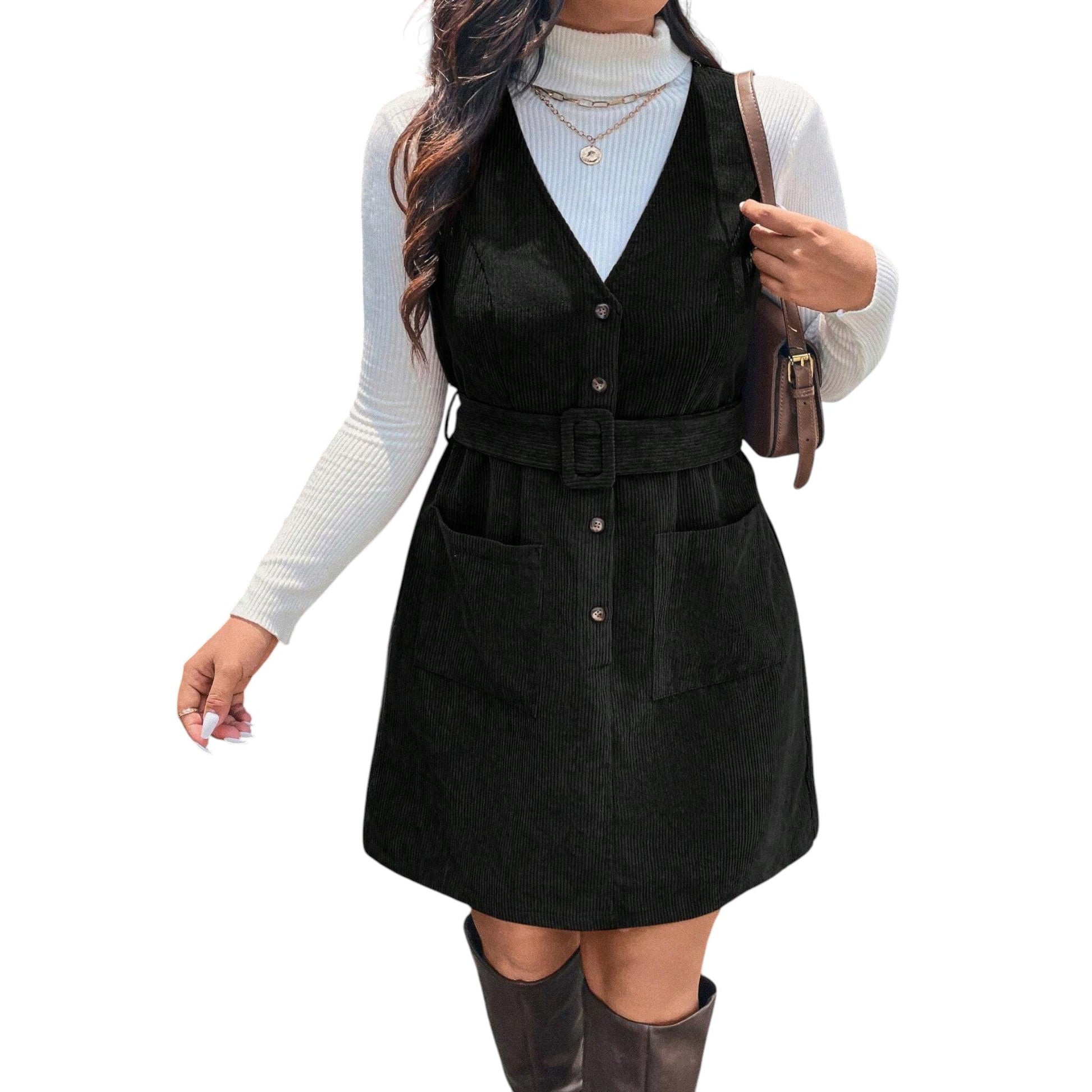 Címke nélküli, fekete, V-nyakú, gombos, zsebes, öves zsinórruha.