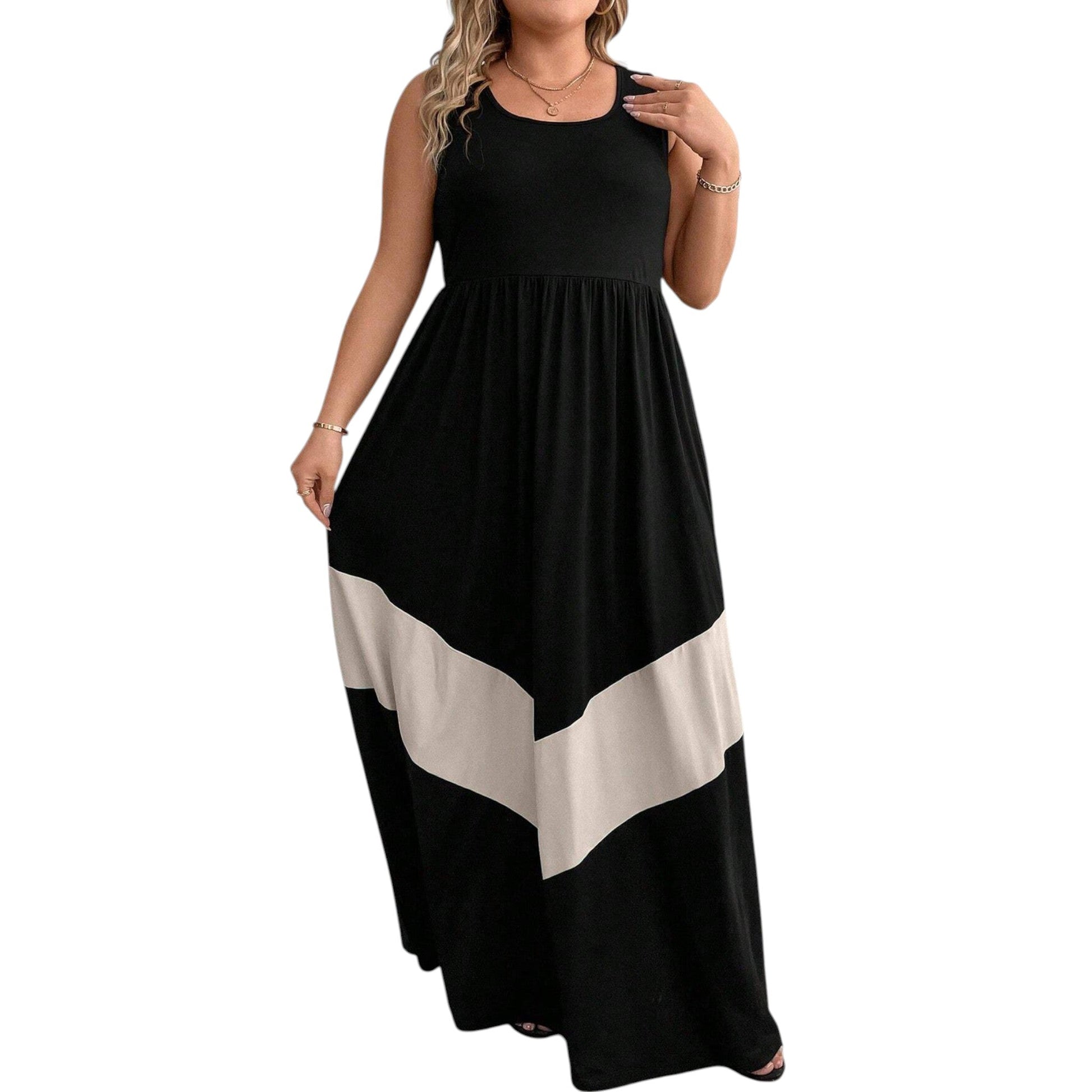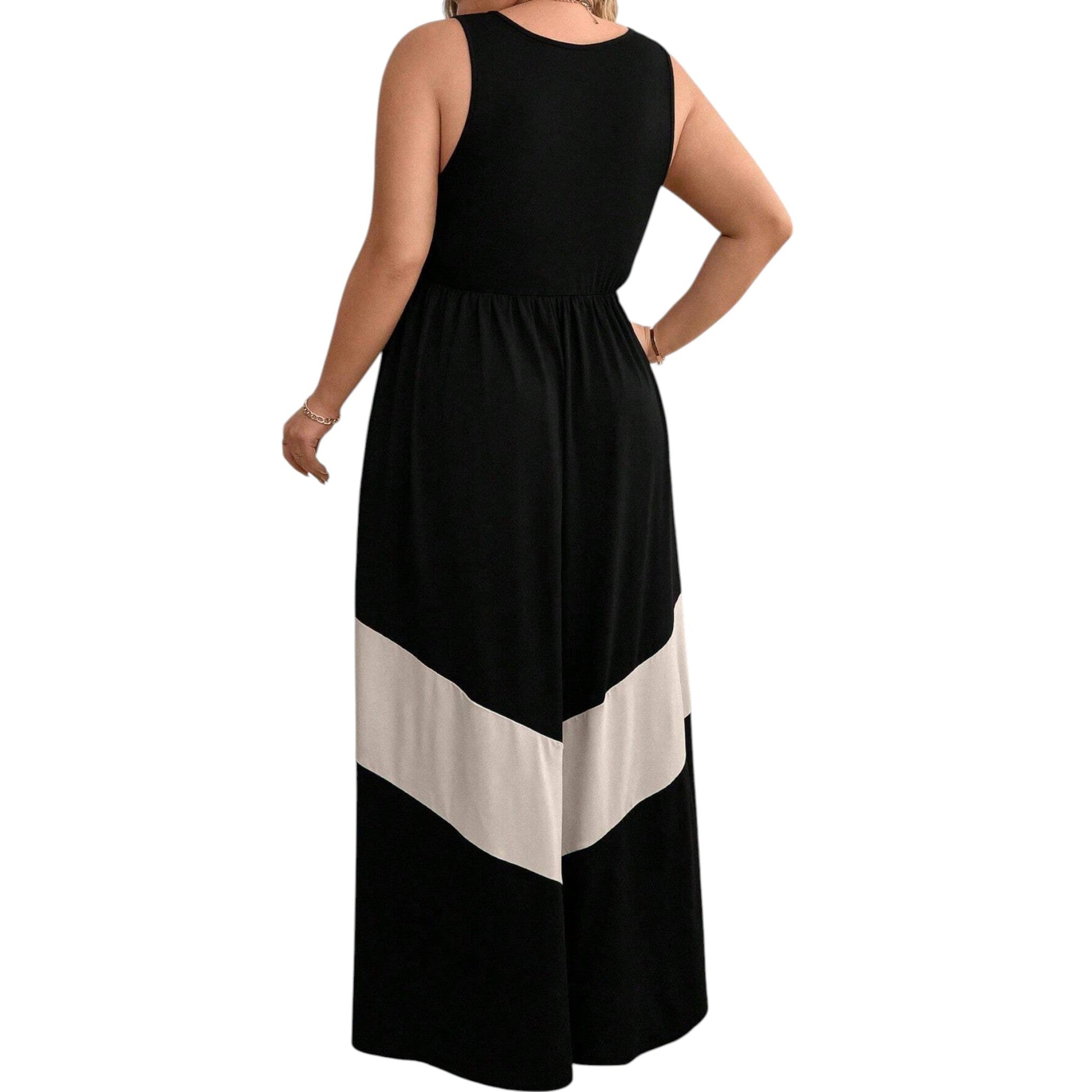 Címke nélküli, fekete, color block mintás, ujjatlan, kerek nyakú maxi ruha