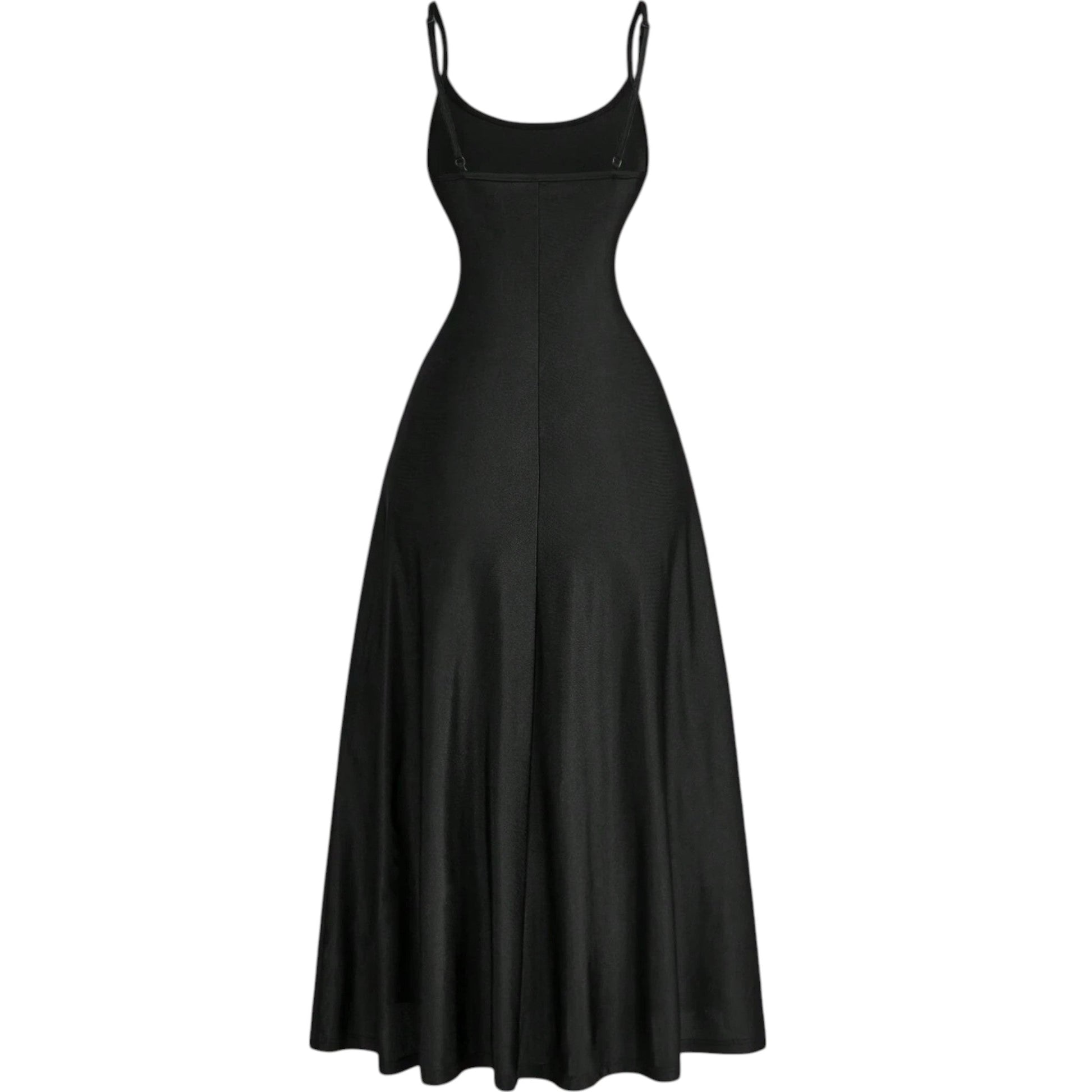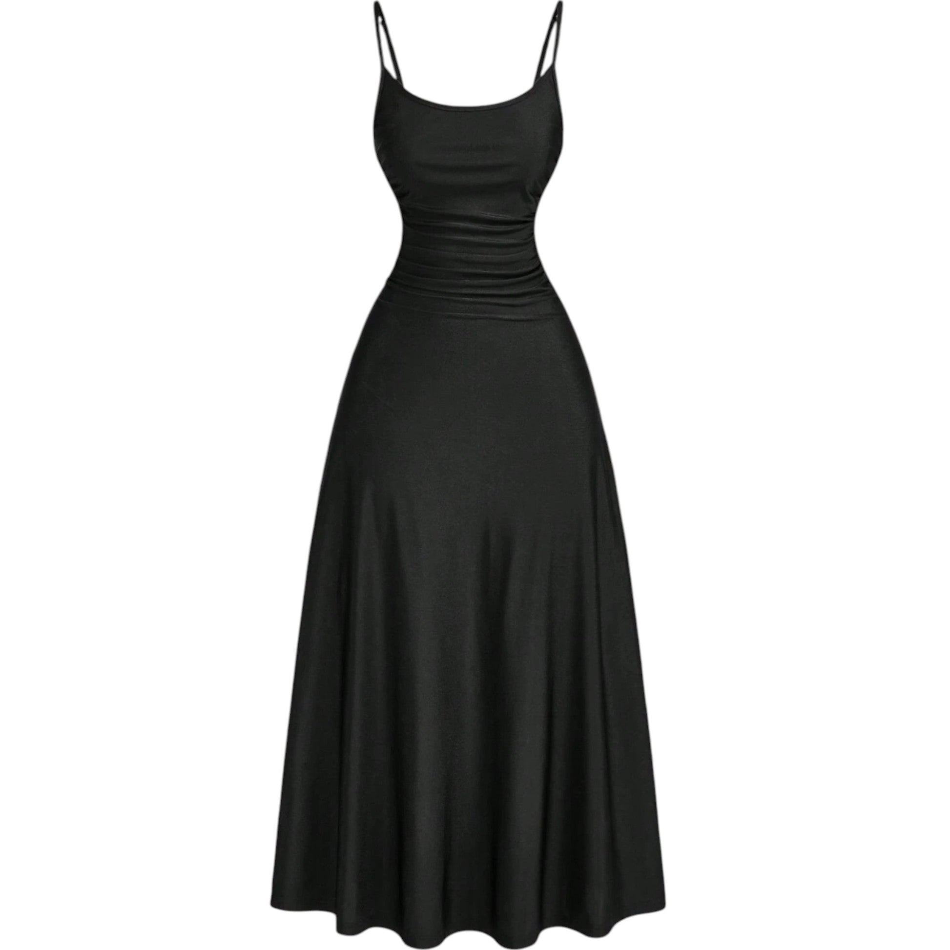 Címke nélküli, fekete, vékony pántos, ráncolt derékrészű, bő szabású maxi ruha.