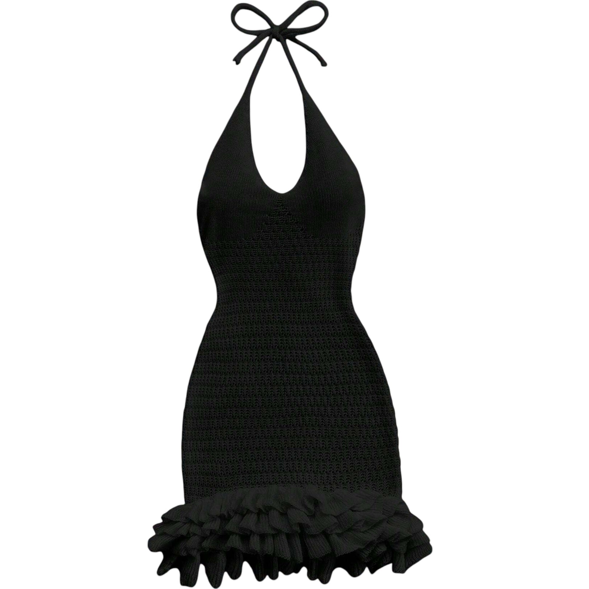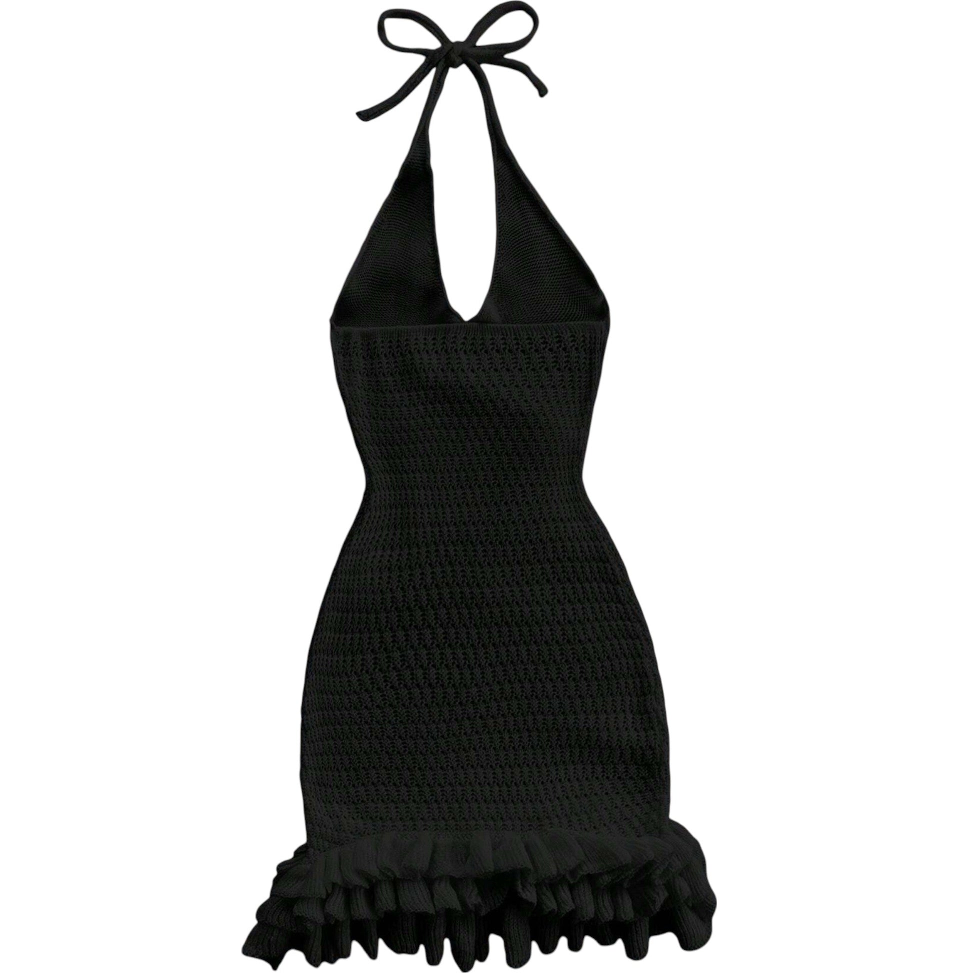 Címke nélküli, fekete, halter nyakú, fodros aljú, kötött mini ruha.