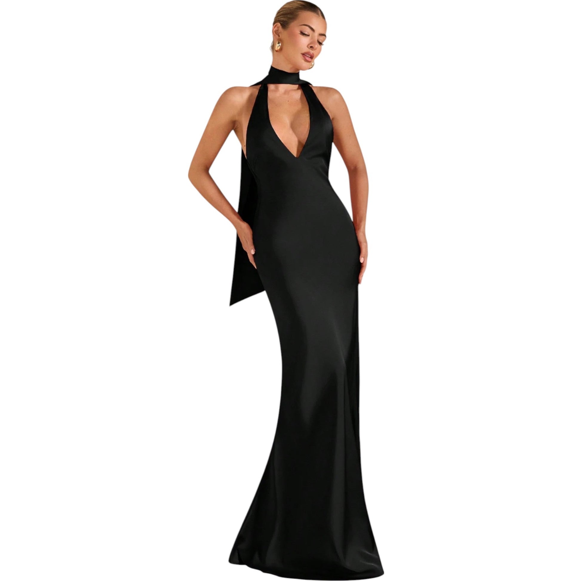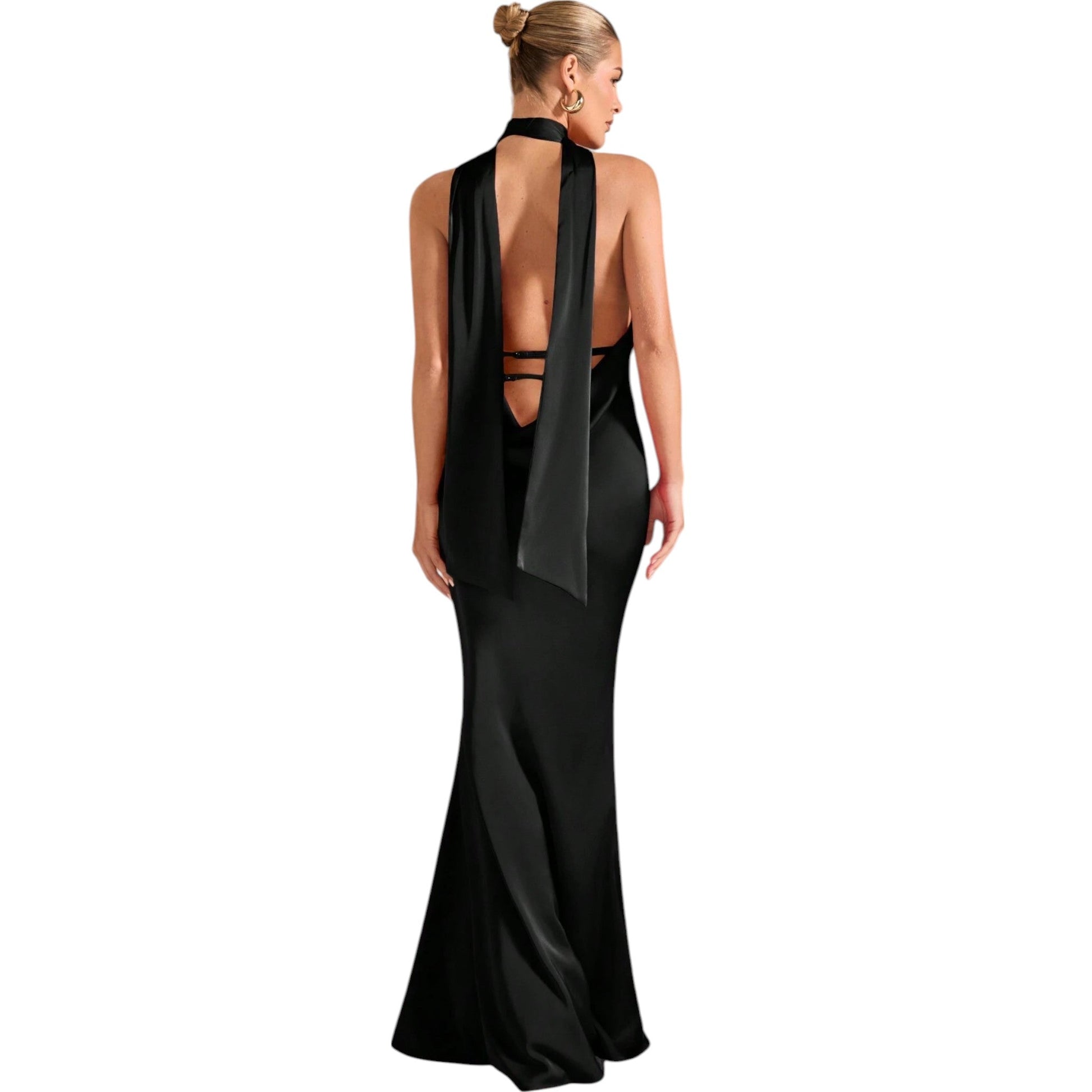 Címke nélküli, fekete, mély dekoltázsú, spagetti pántos, hátul megkötős, hosszú.