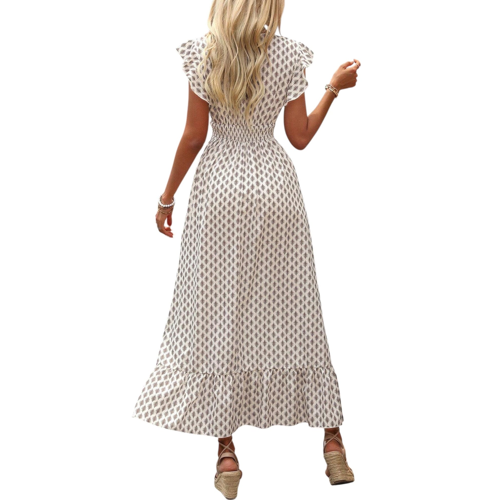 Címke nélküli, mintás, V-nyakú, rövid ujjú, fodros, maxi ruha, oldalt sliccelt.