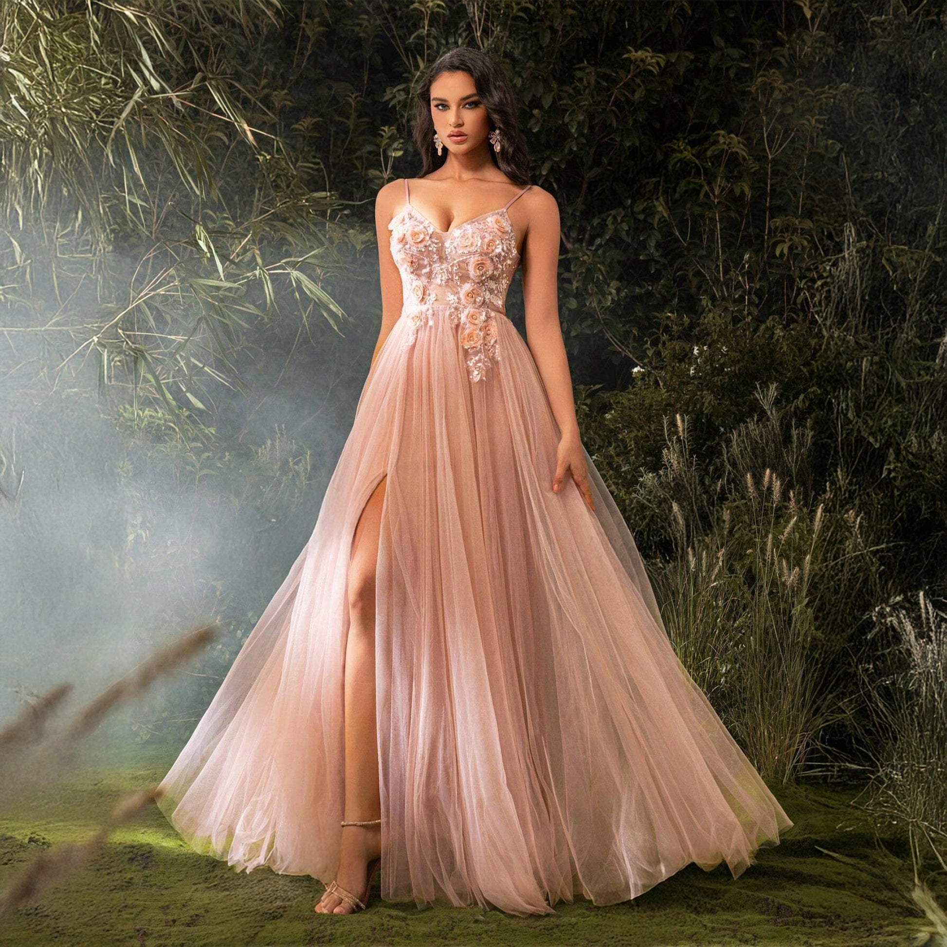 Címke nélküli, rózsaszín, spagettipántos, V-nyakú, virág díszítésű, magas sliccű, tüll maxi ruha.