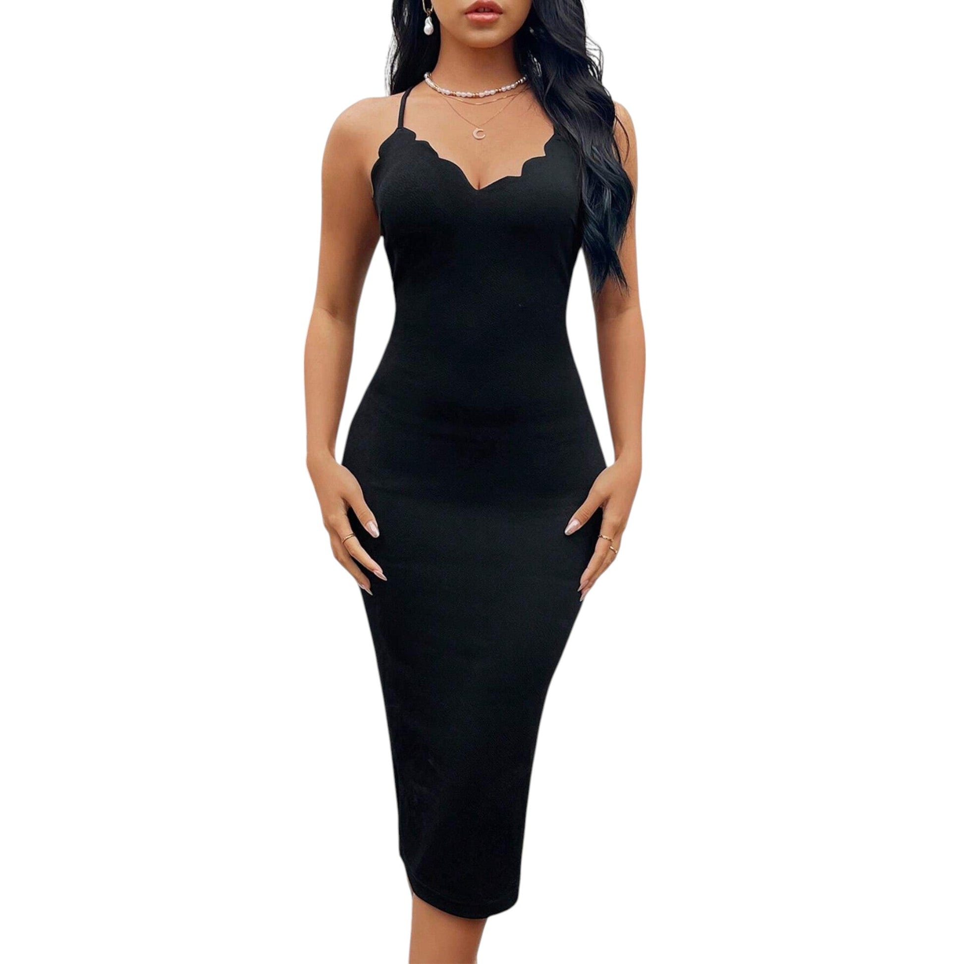 Címke nélküli, fekete, spagetti pántos, szív alakú, fodros dekoltázzsal, testhezálló midi ruha.