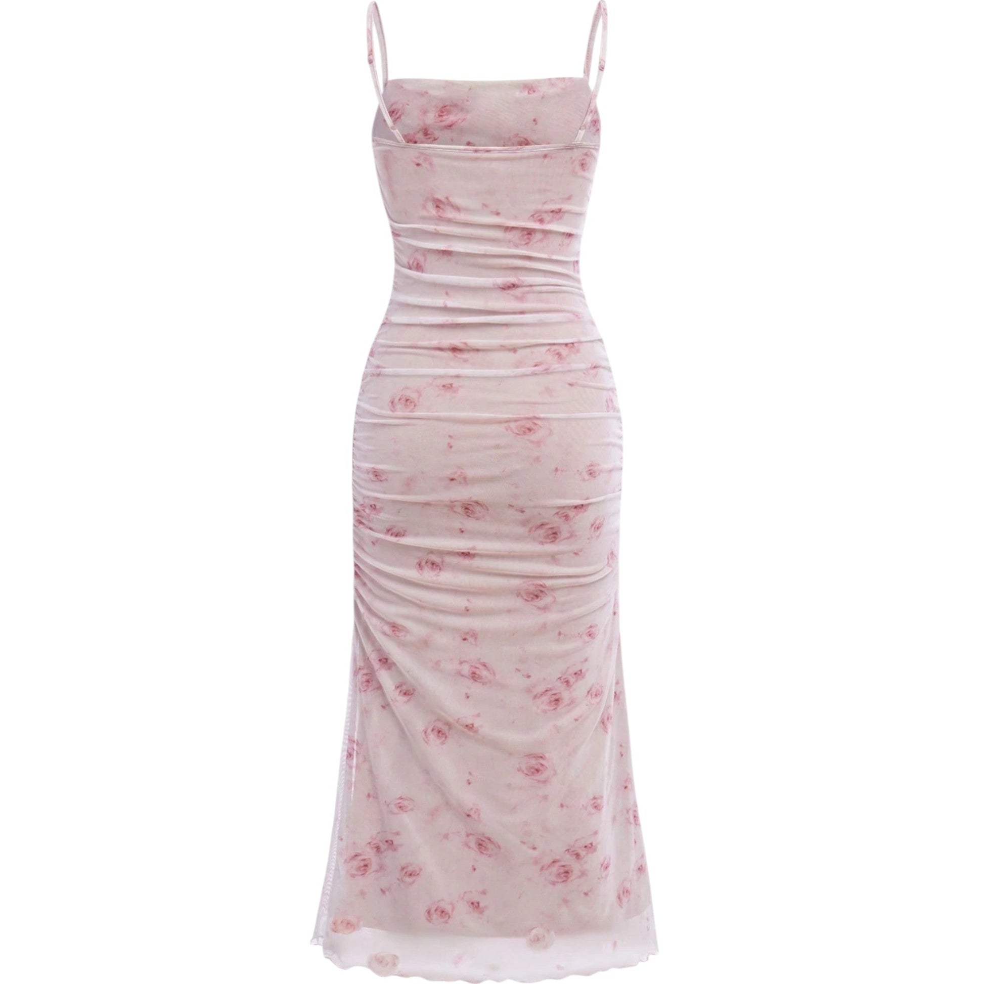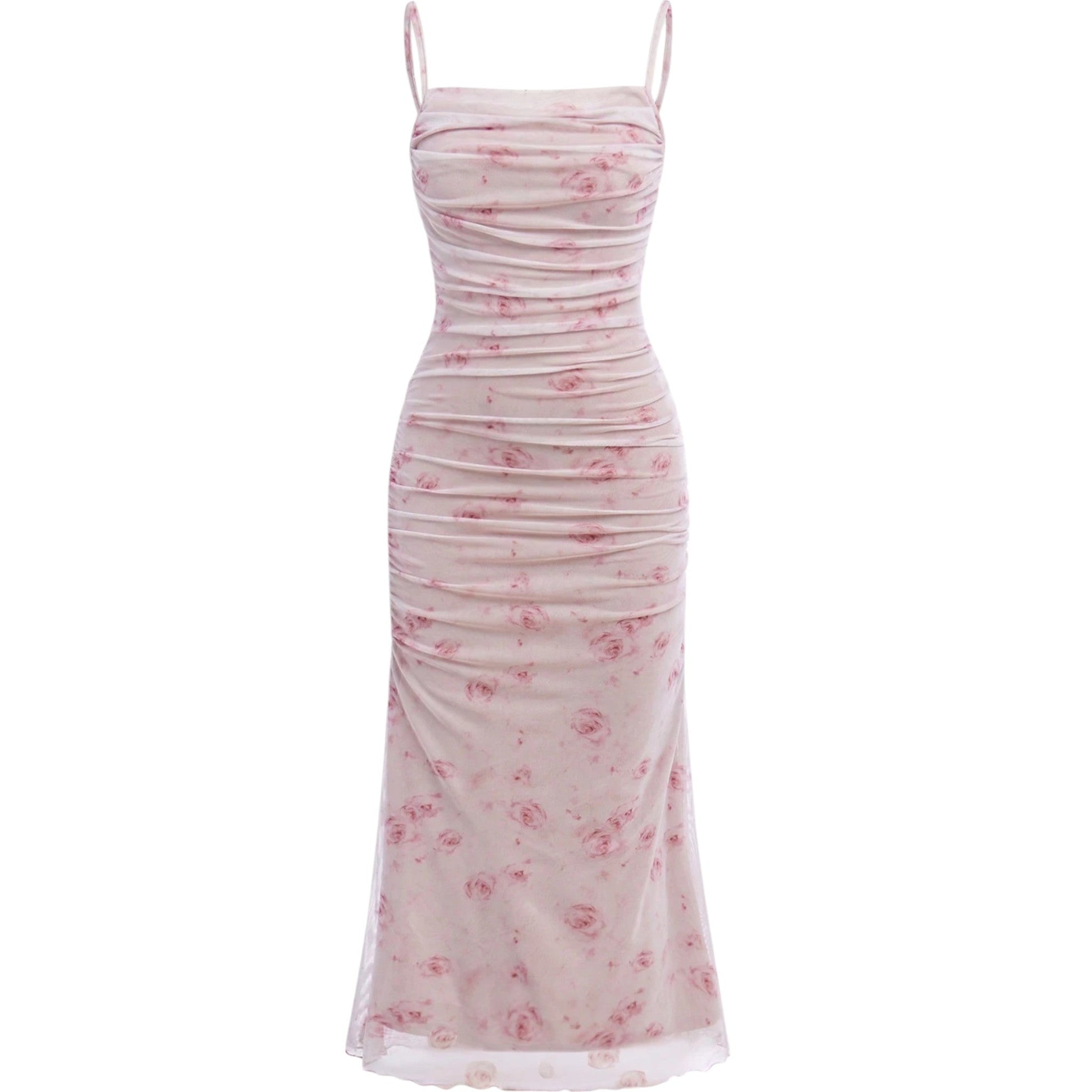 Címke nélküli, rózsaszín, virágmintás, spagetti pántos, ráncolt midi ruha.