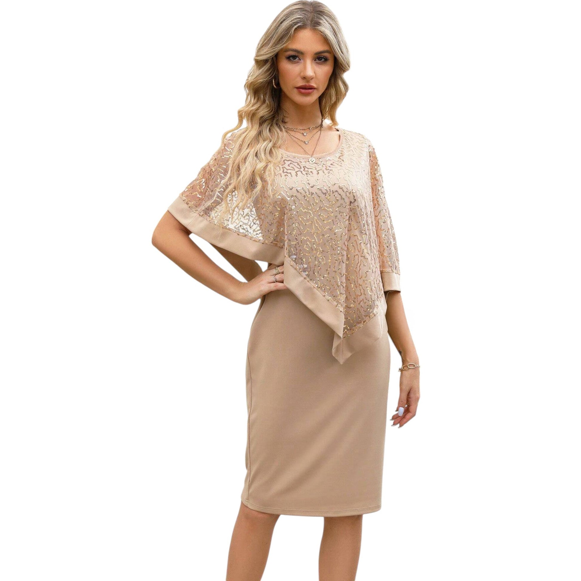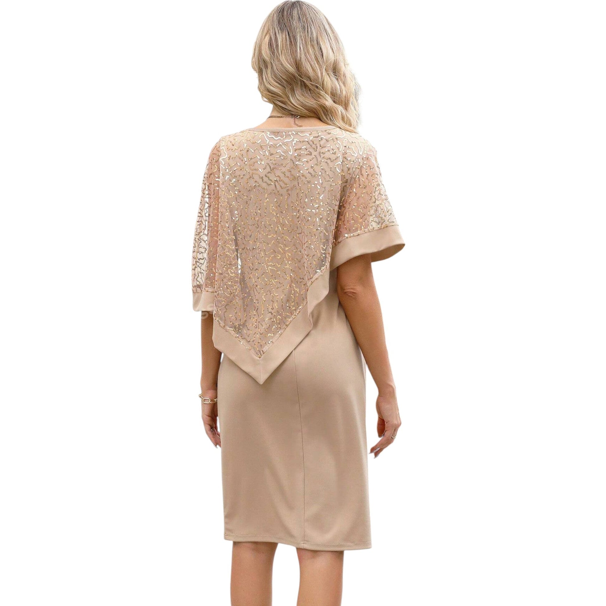 Címke nélküli, bézs színű koktélruha. Kerek nyakú, ujjatlan alj, rávarrt rövid ujjú, mintás, áttetsző felsővel, ami aszimmetrikus szabású.