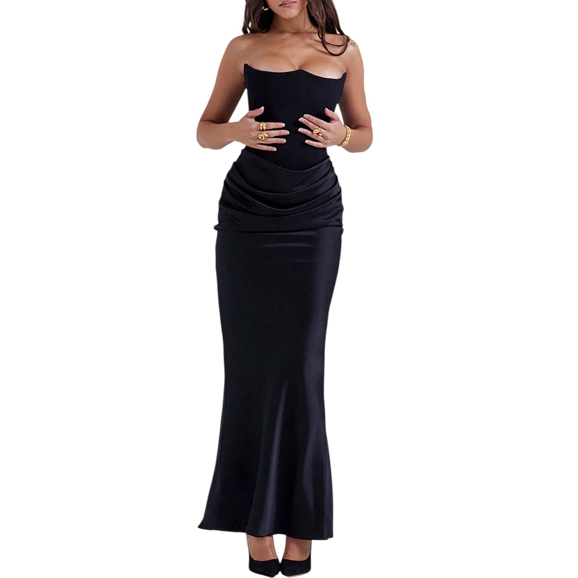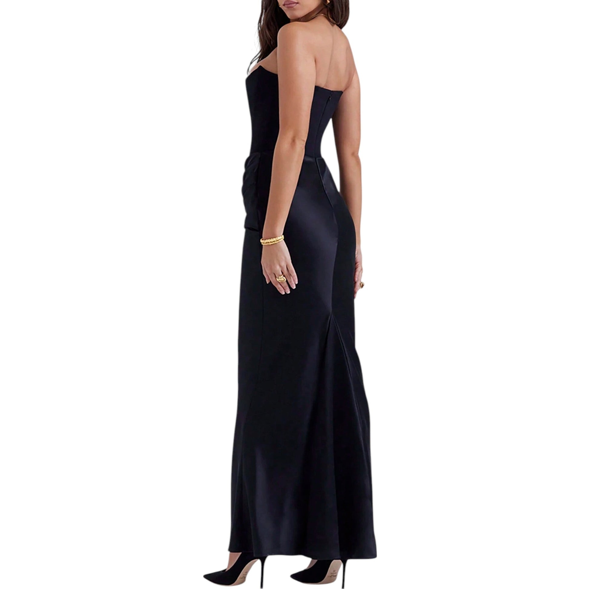 Címke nélküli, fekete, pánt nélküli, mellrészen merevített, testhezálló, hosszú estélyi ruha.