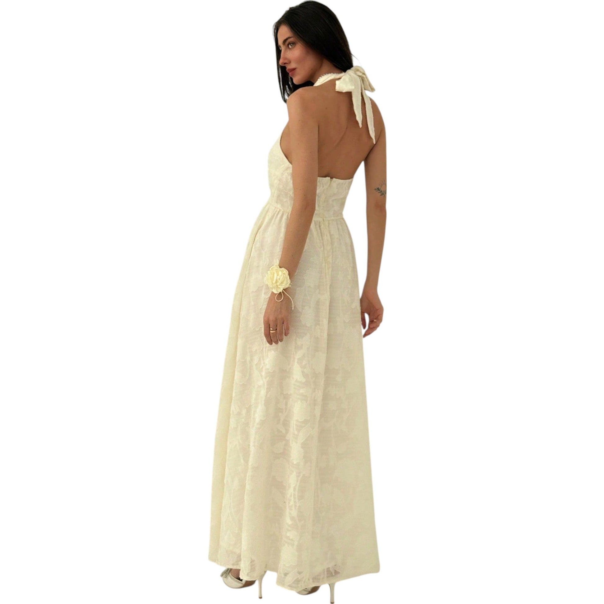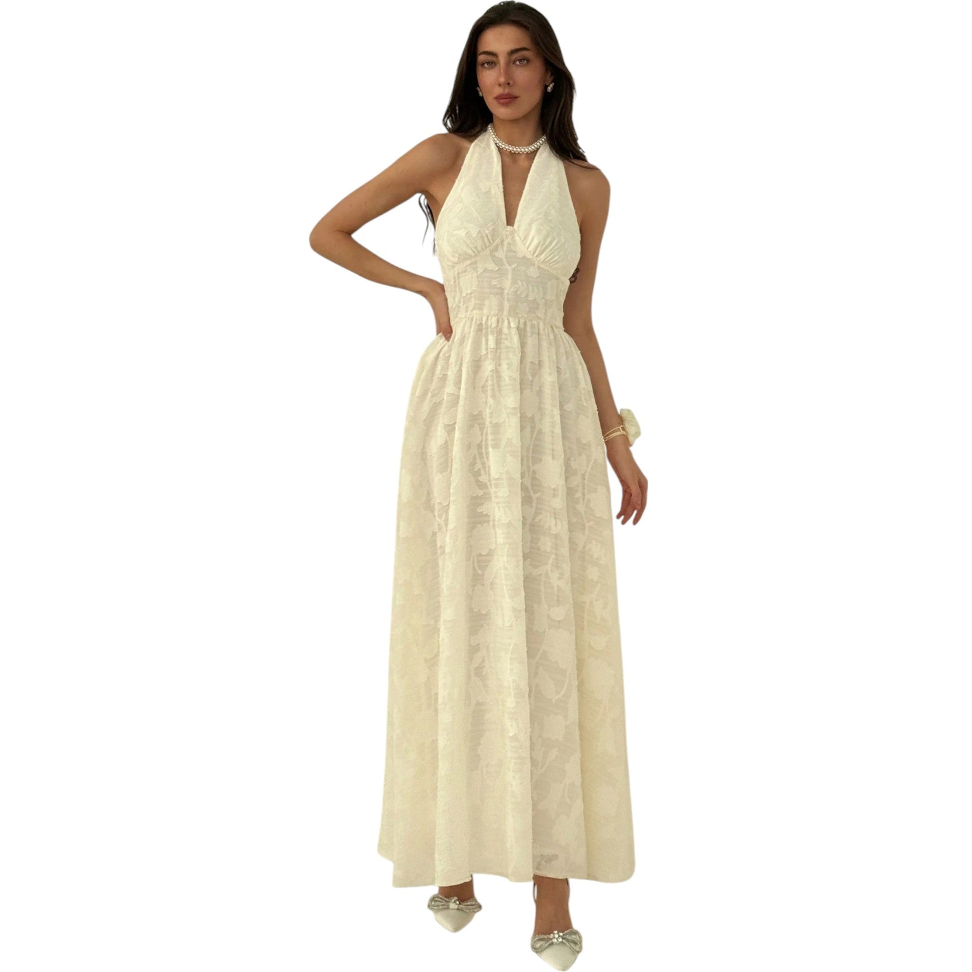 Címke nélküli, törtfehér, halter nyakú maxi ruha, hátul nyitott, strukturált felsőrésszel és A-vonalú, mintás szoknyarésszel.