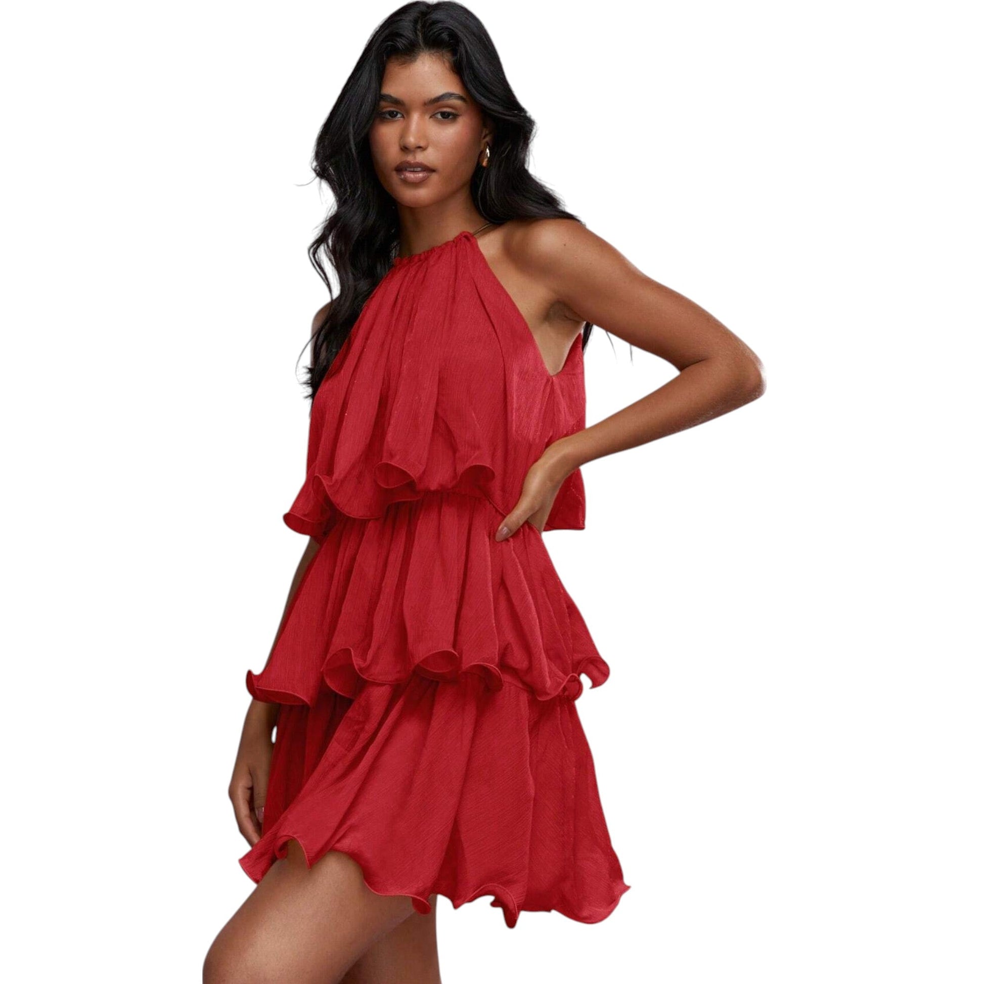 Címke nélküli, piros, nyakba akasztós (halter) mini ruha, réteges fodrokkal, bő szabású, enyhén texturált anyagból.