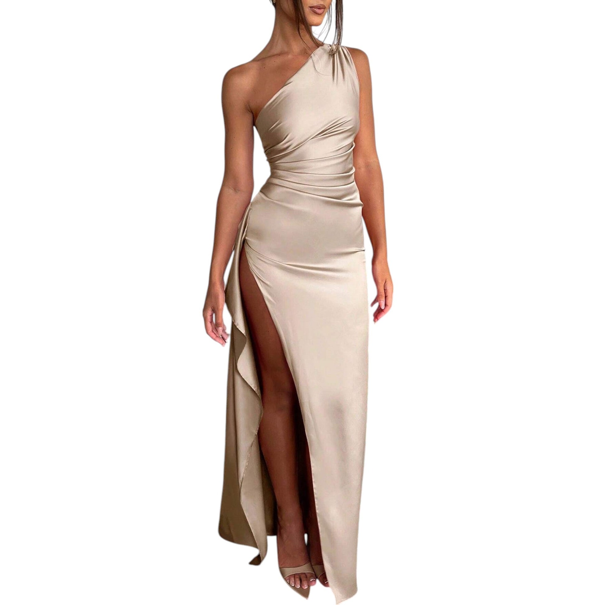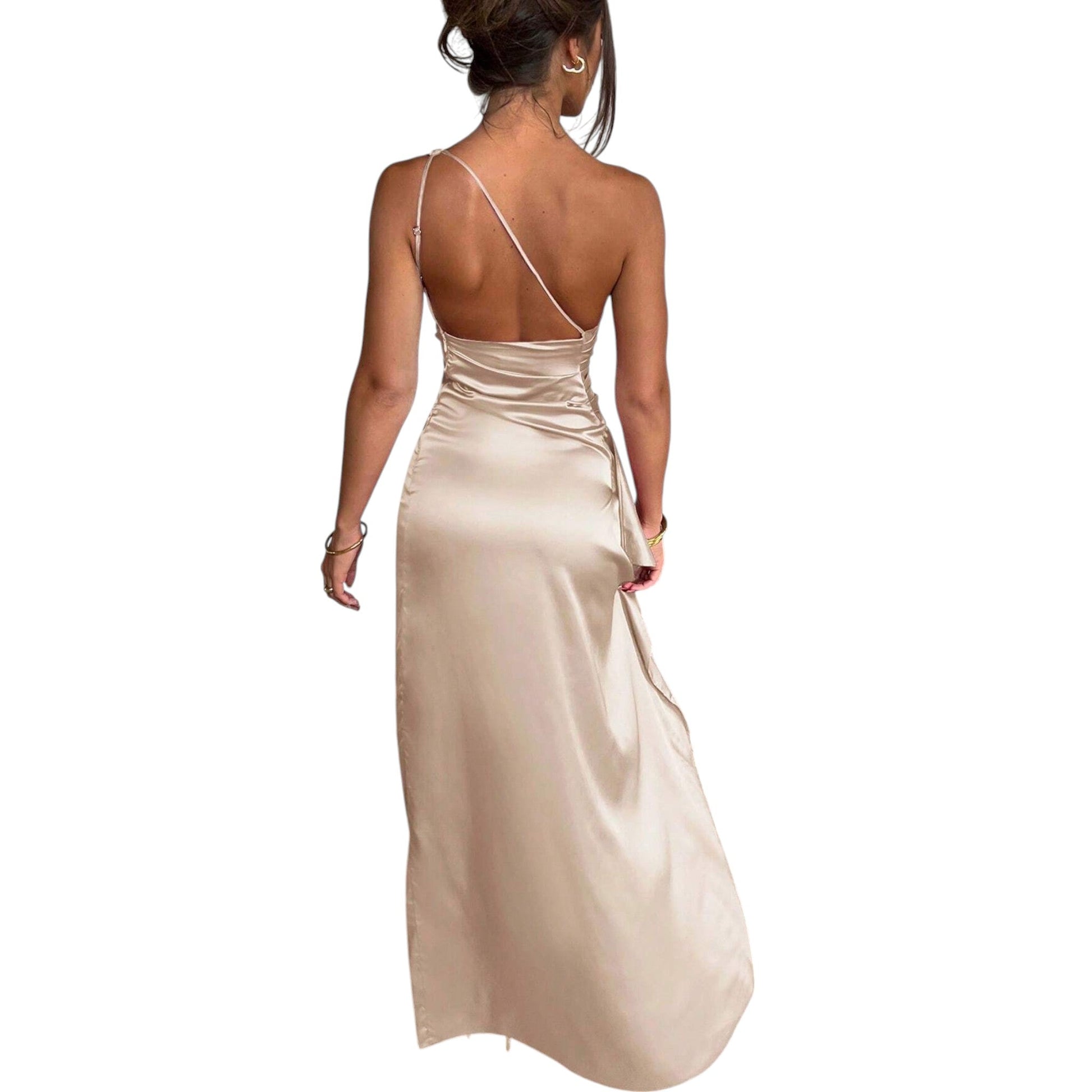 Címke nélküli, bézs, félvállas maxi ruha. Enyhén fényes anyagból készült, ráncolt és drapériás részletekkel. Oldalán magas slicceléssel és fodrokkal.