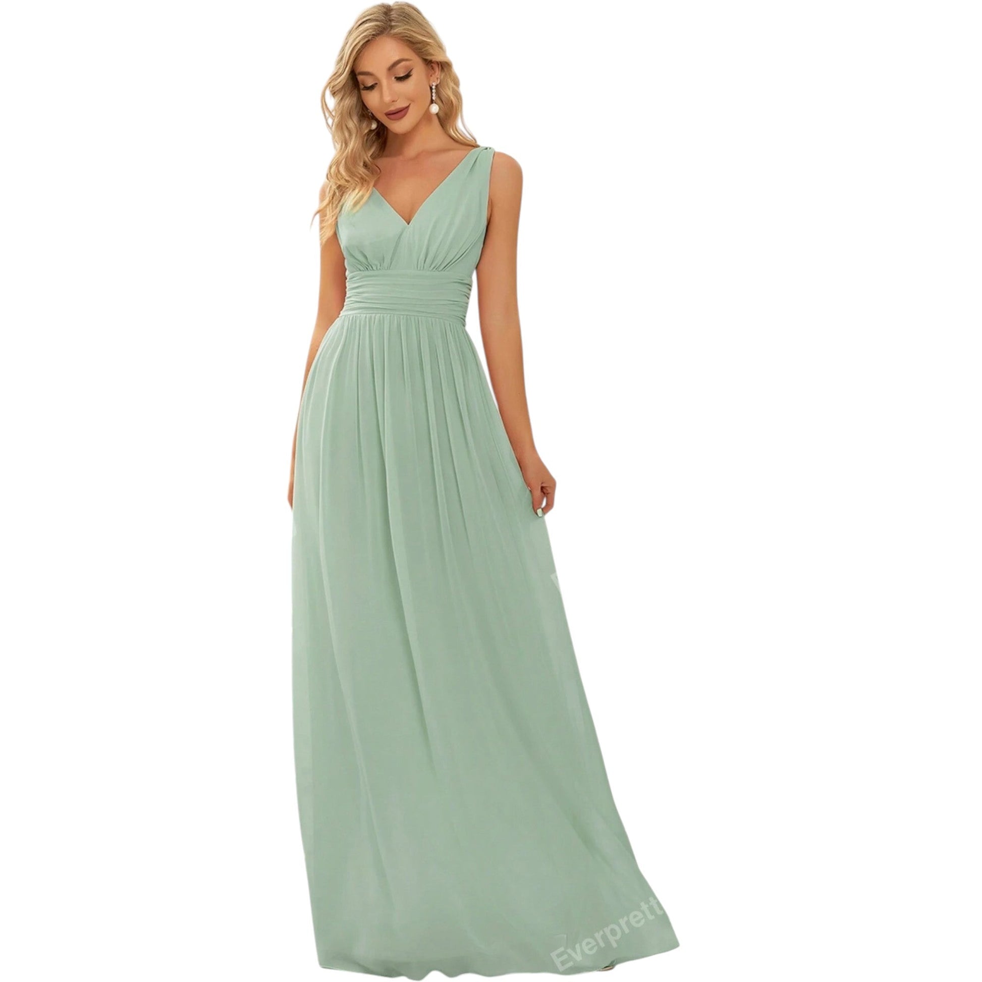 Címke nélküli, világoszöld, V-nyakú, ujjatlan, redőzött derékrésszel, hosszú maxi ruha.