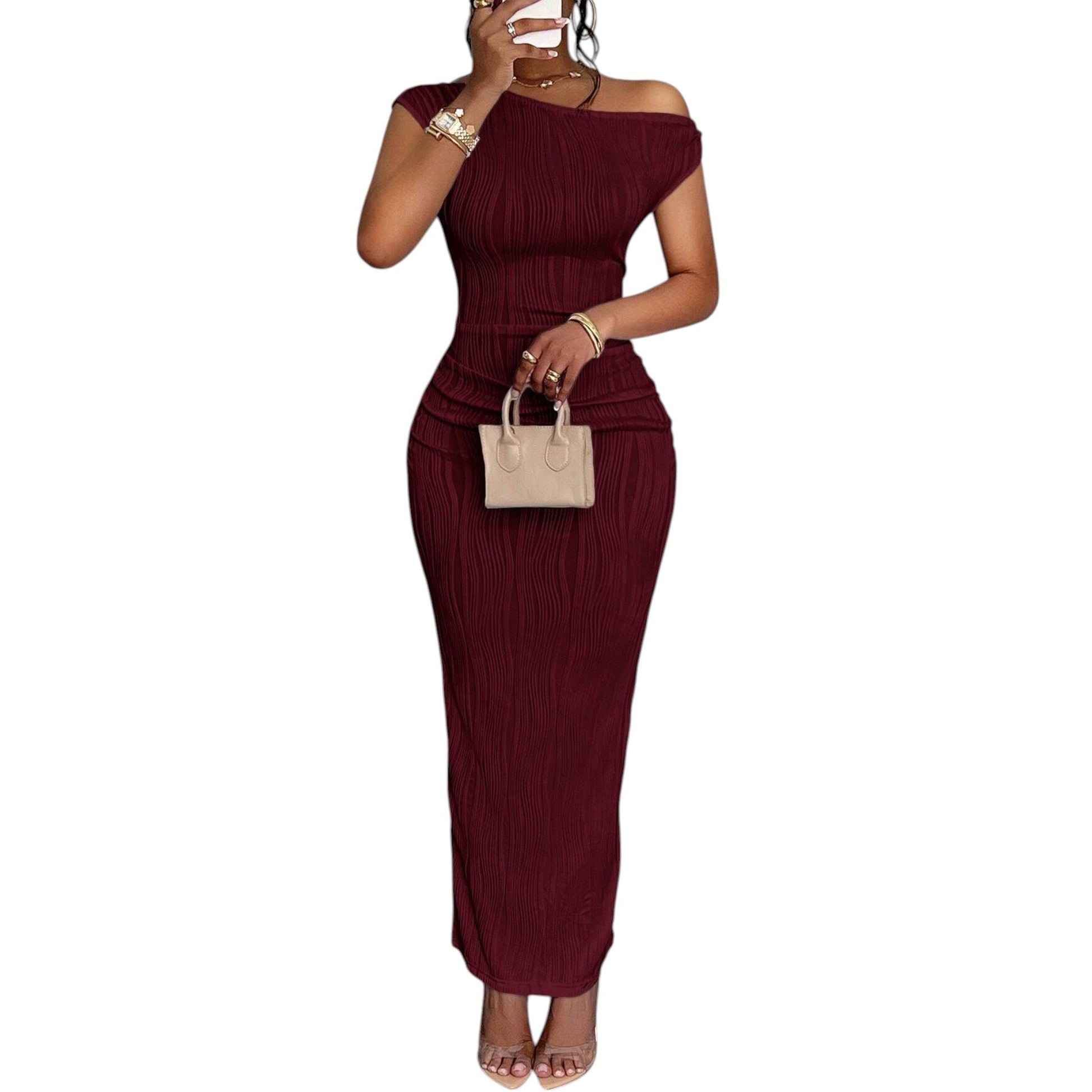 Címke nélküli, bordó, ráncolt, félvállas, rövid ujjú, testhezálló, maxi ruha.