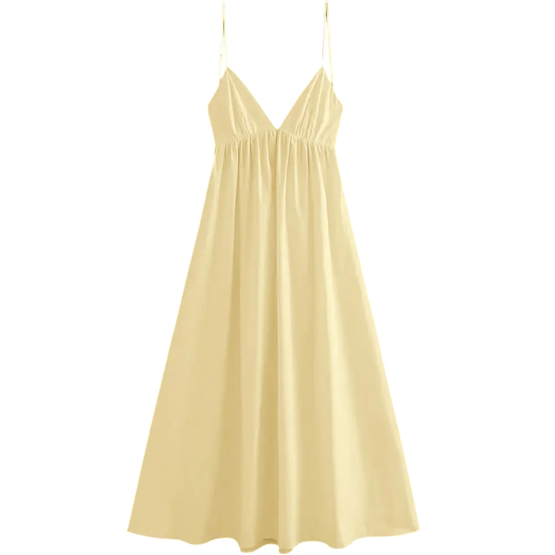 Címke nélküli, sárga, vékony spagetti pántos, V-nyakú, hosszú ruha, bővülő szoknyarésszel.