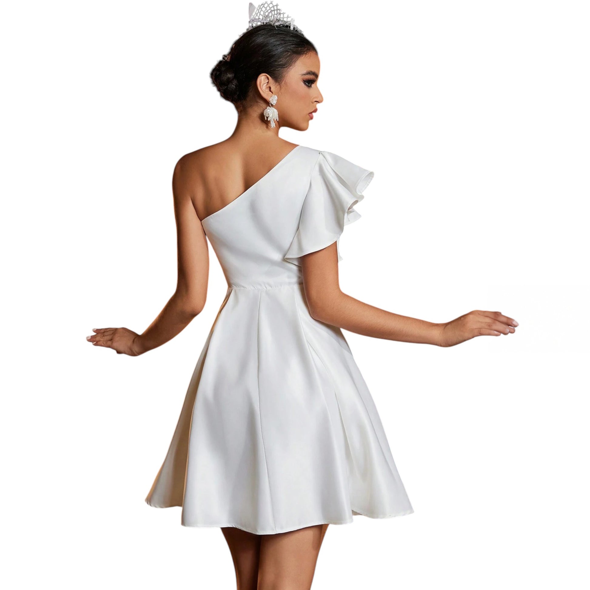 Címke nélküli, ekrü, mini, egy vállpántos, fodros ujjú, bővülő szoknyás.