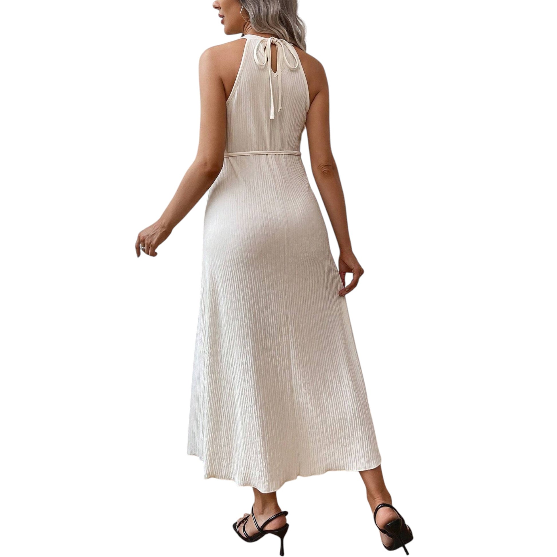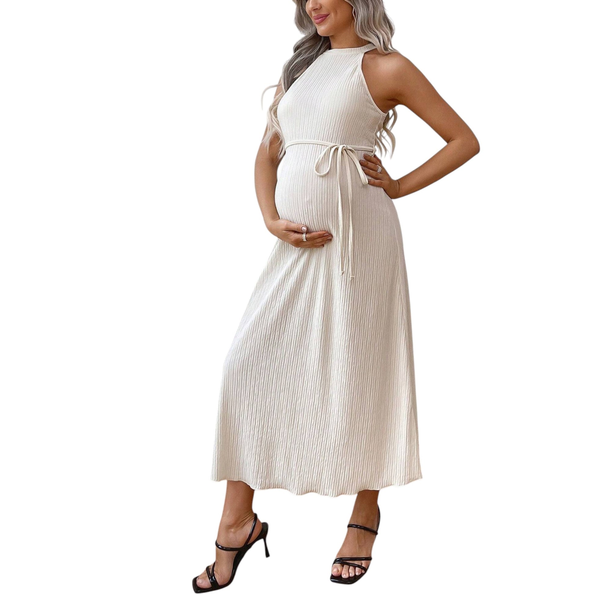 Címke nélküli, vajszínű, ujjatlan, magas nyakú, bordázott anyagú, megkötős kismama hosszú ruha.
