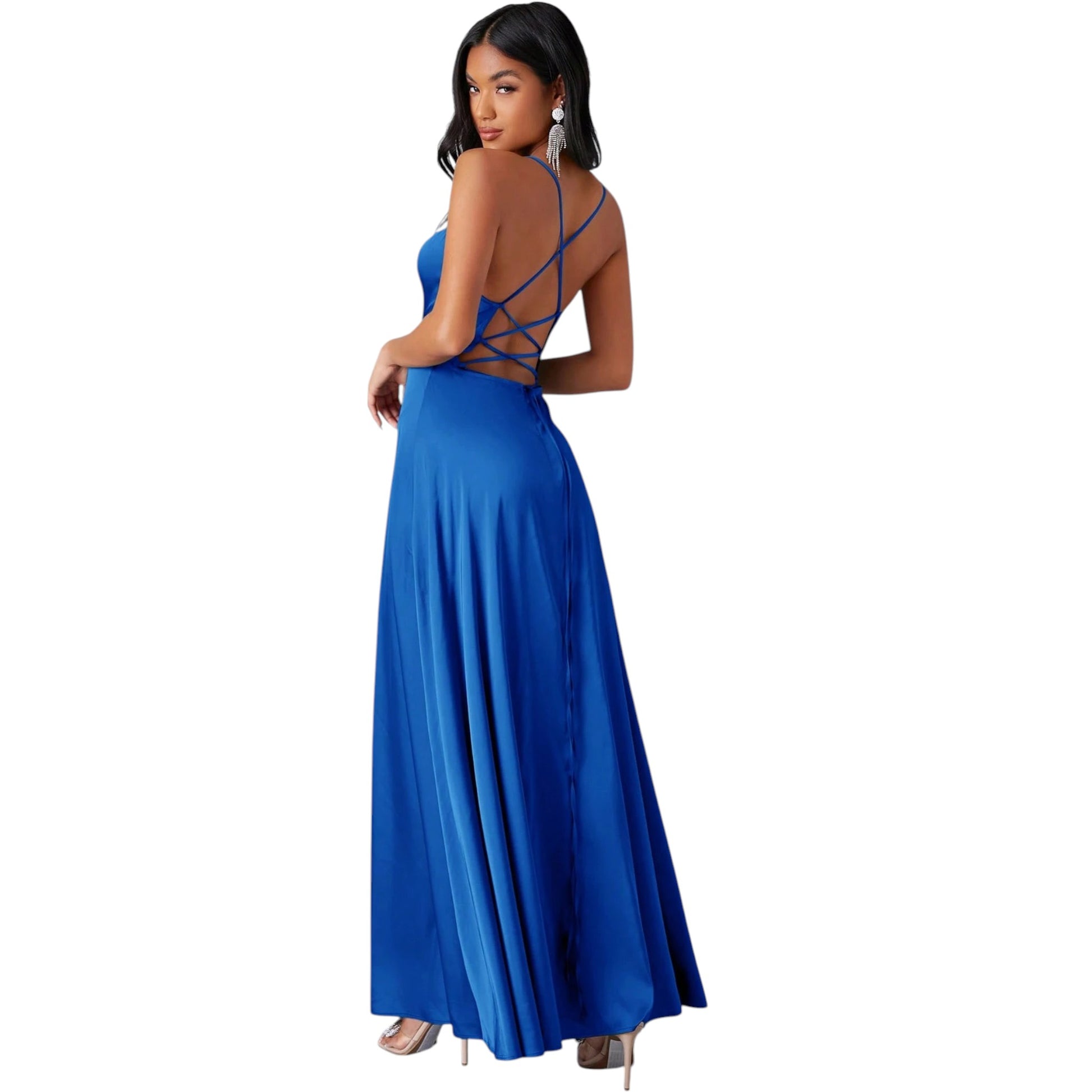 Címke nélküli, kék, selyemhatású hosszú ruha, spagettipánttal, lezser nyakkivágással és magas oldalsó felslicceléssel.