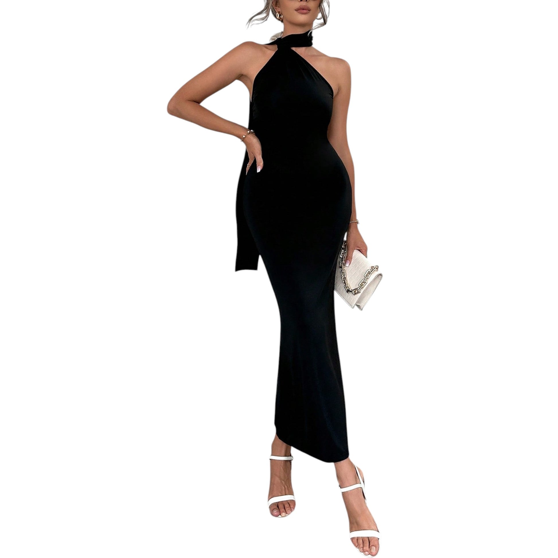 Címke nélküli, fekete, nyakpántos, ujjatlan, hosszú maxi ruha, oldalt slicceléssel.