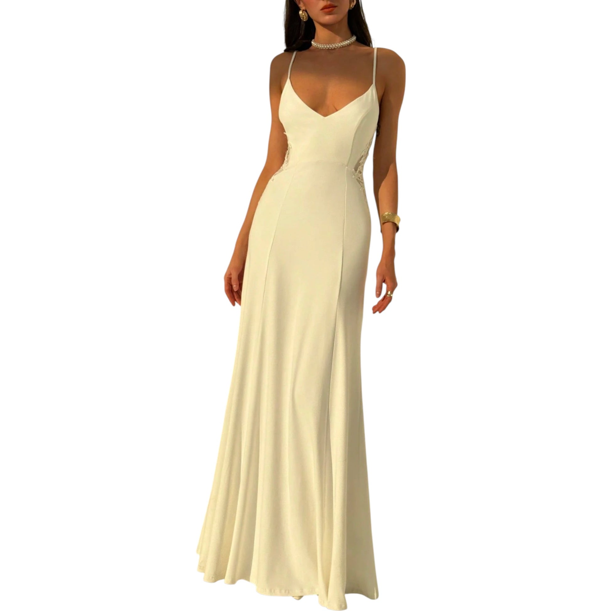 Címke nélküli, ekrü, spagetti pántos, V-nyakú, testhezálló maxi ruha, a derékrészen csipkebetéttel.