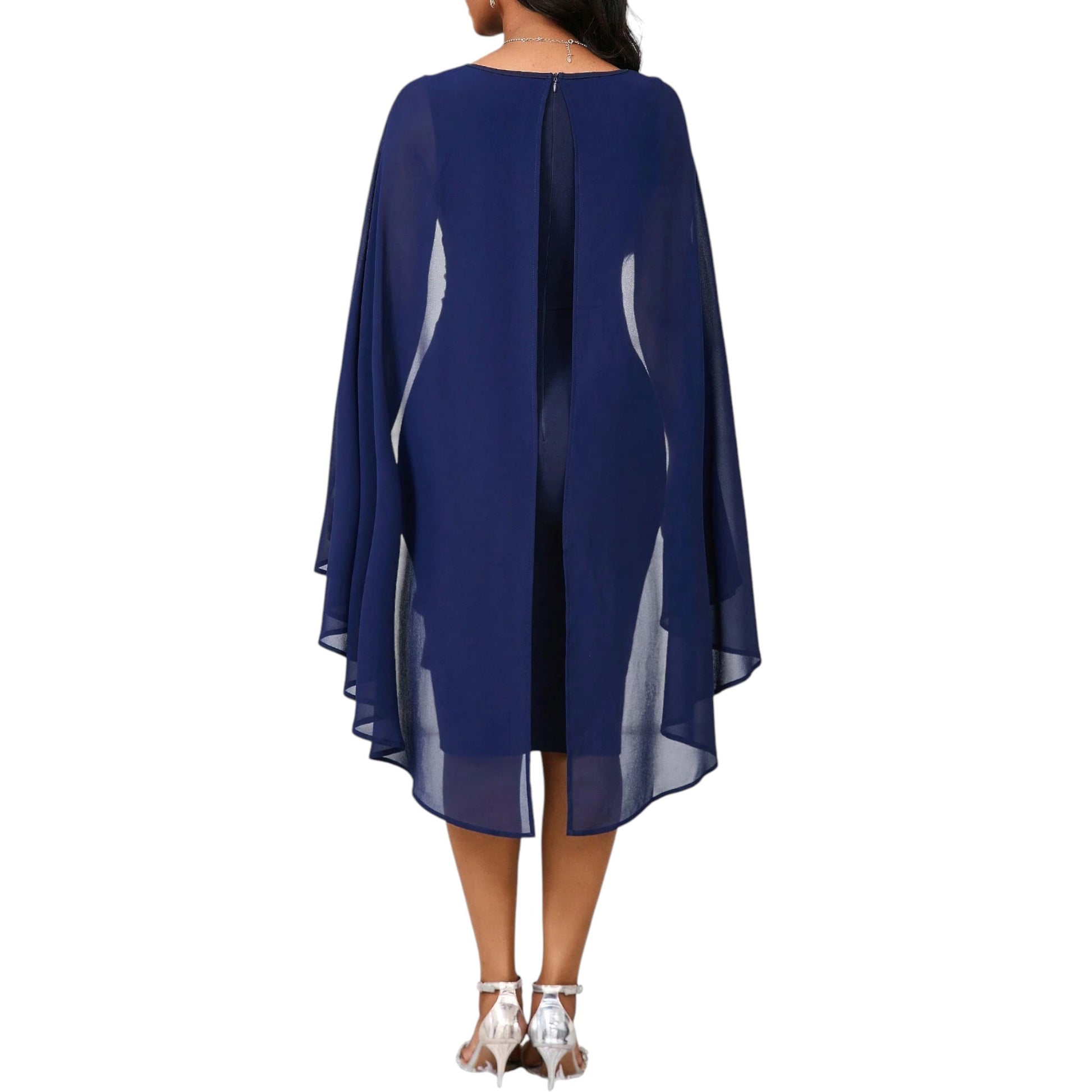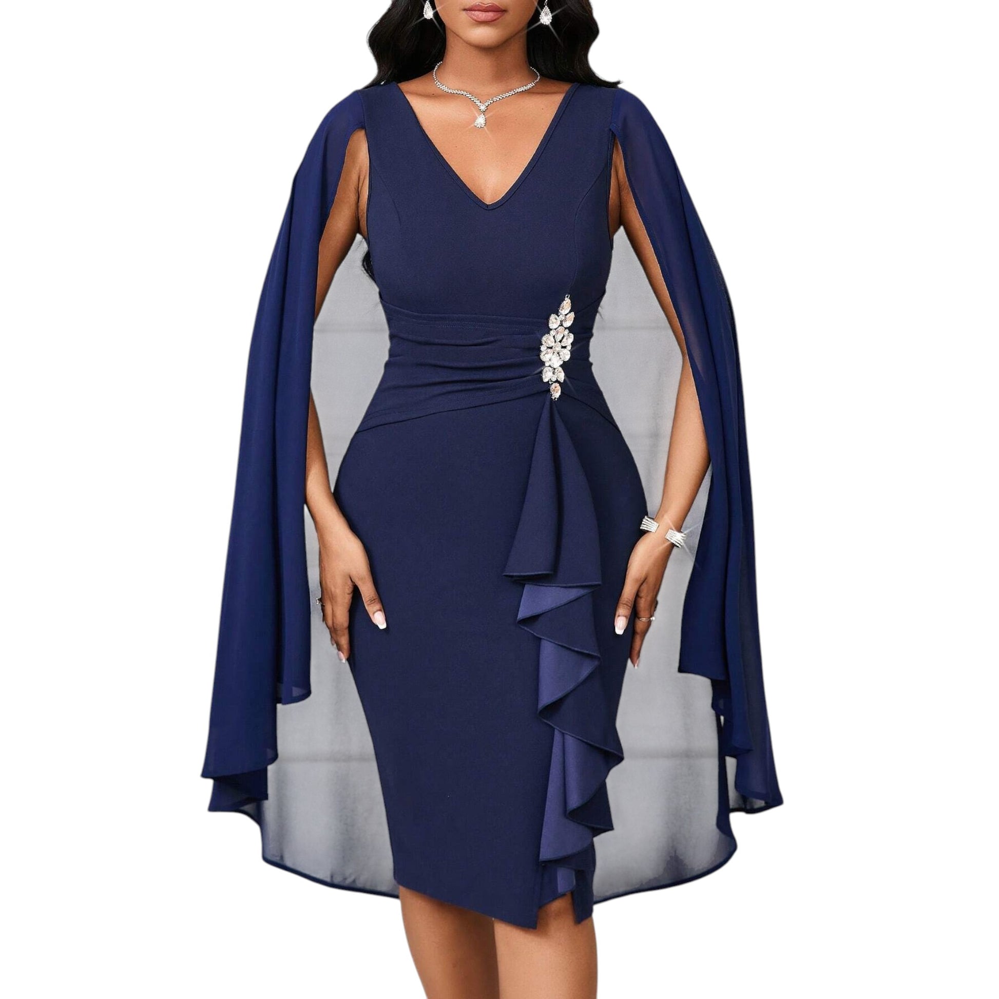 Címke nélküli, sötétkék, V-nyakú, ujjatlan, oldalán fodros díszítéssel és egy rávarrt brossal, hátul pedig egy uszály van hozzá varrva.