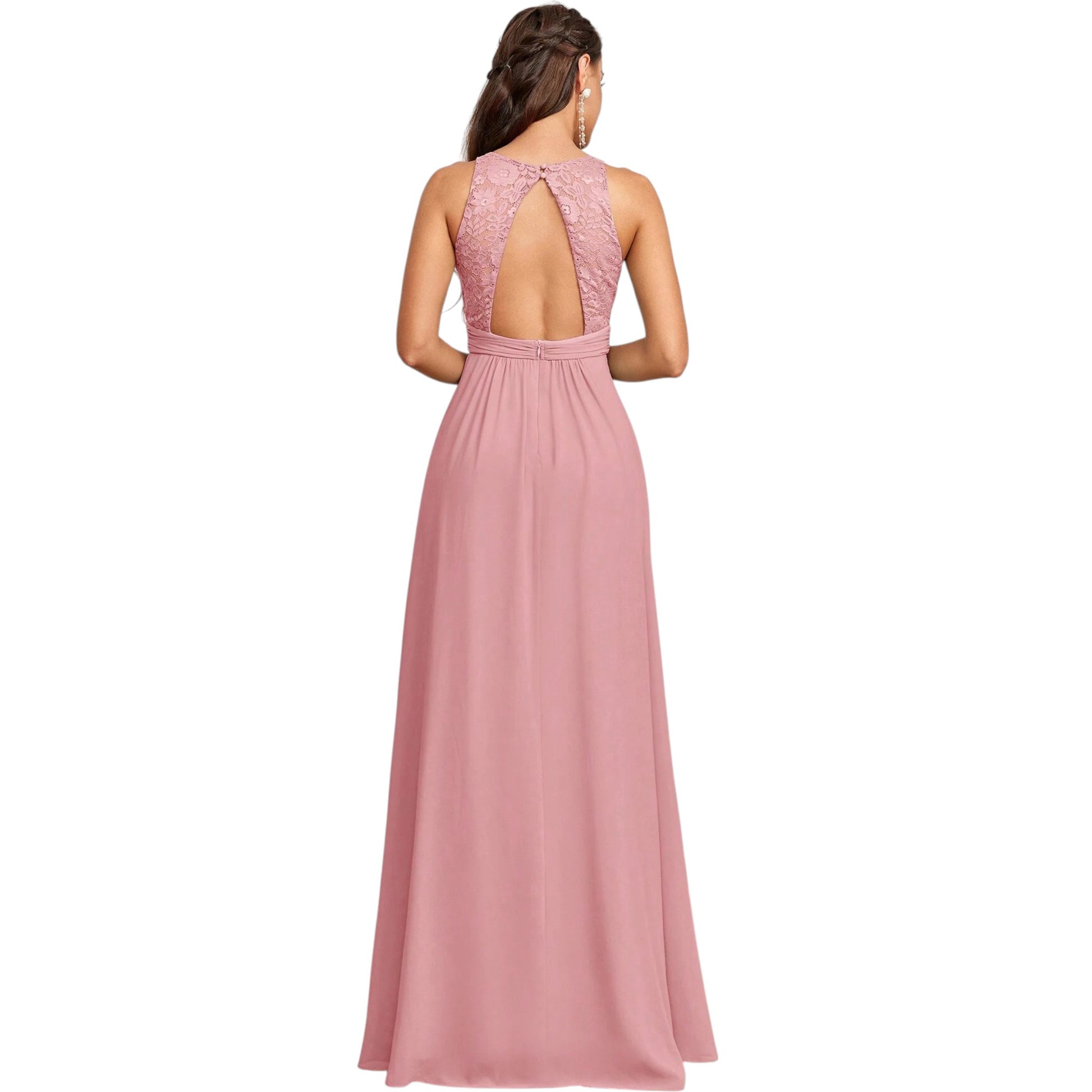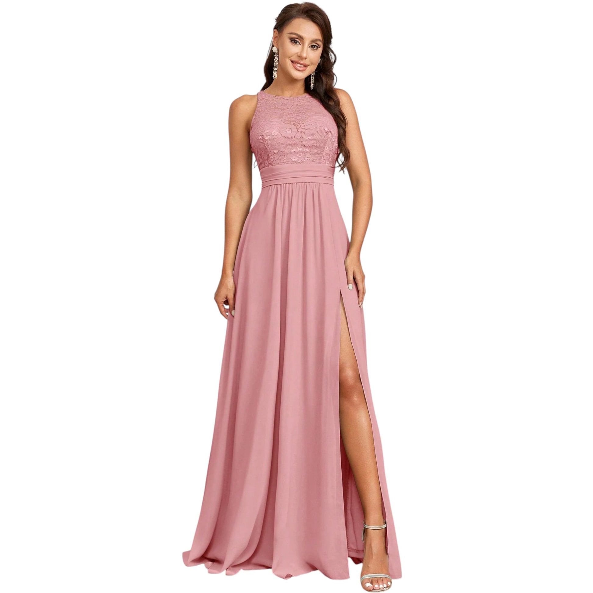 Címke nélküli, rózsaszín, ujjatlan, hímzett felsőrésszel, V-nyakú, oldalt felsliccelt hosszú ruha.