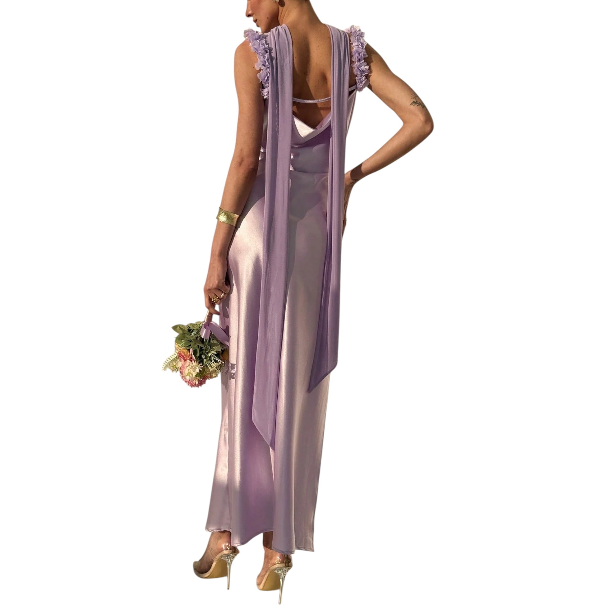 Címke nélküli, lila, spagetti pántos, selyemhatású, hasított maxi ruha, a vállakon és a nyakrészen virágos díszítéssel.
