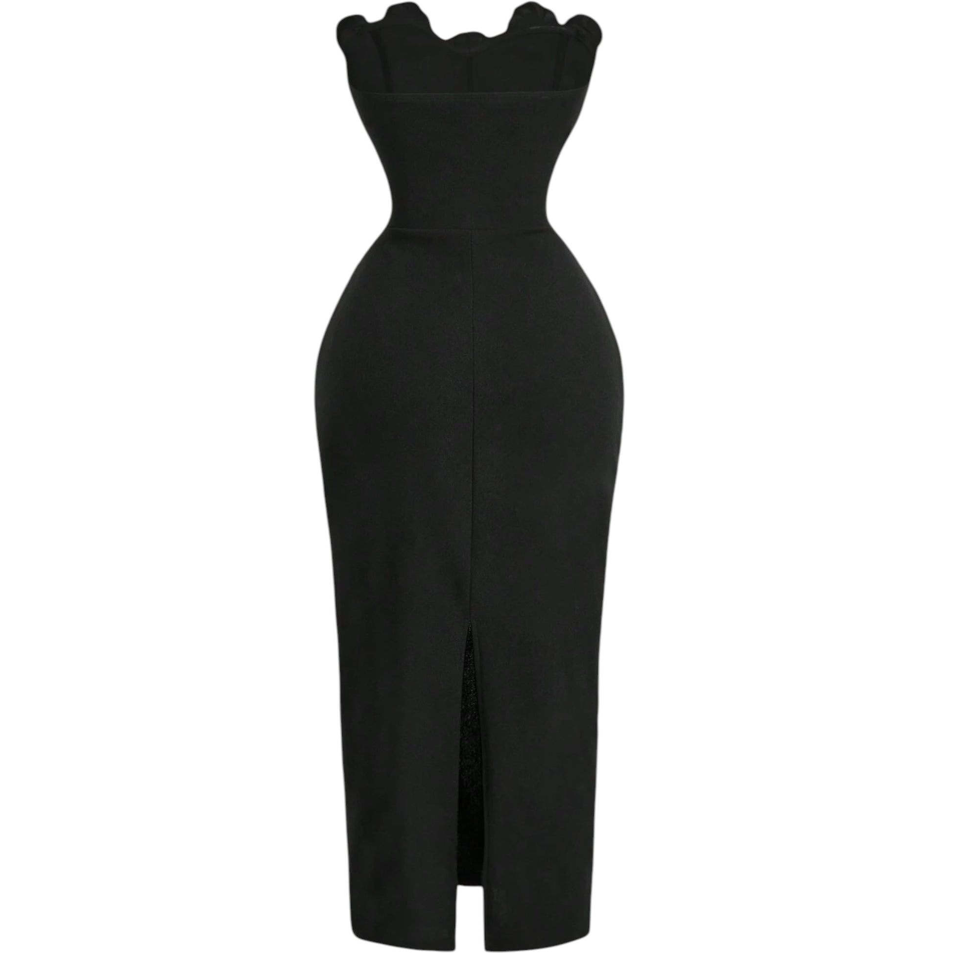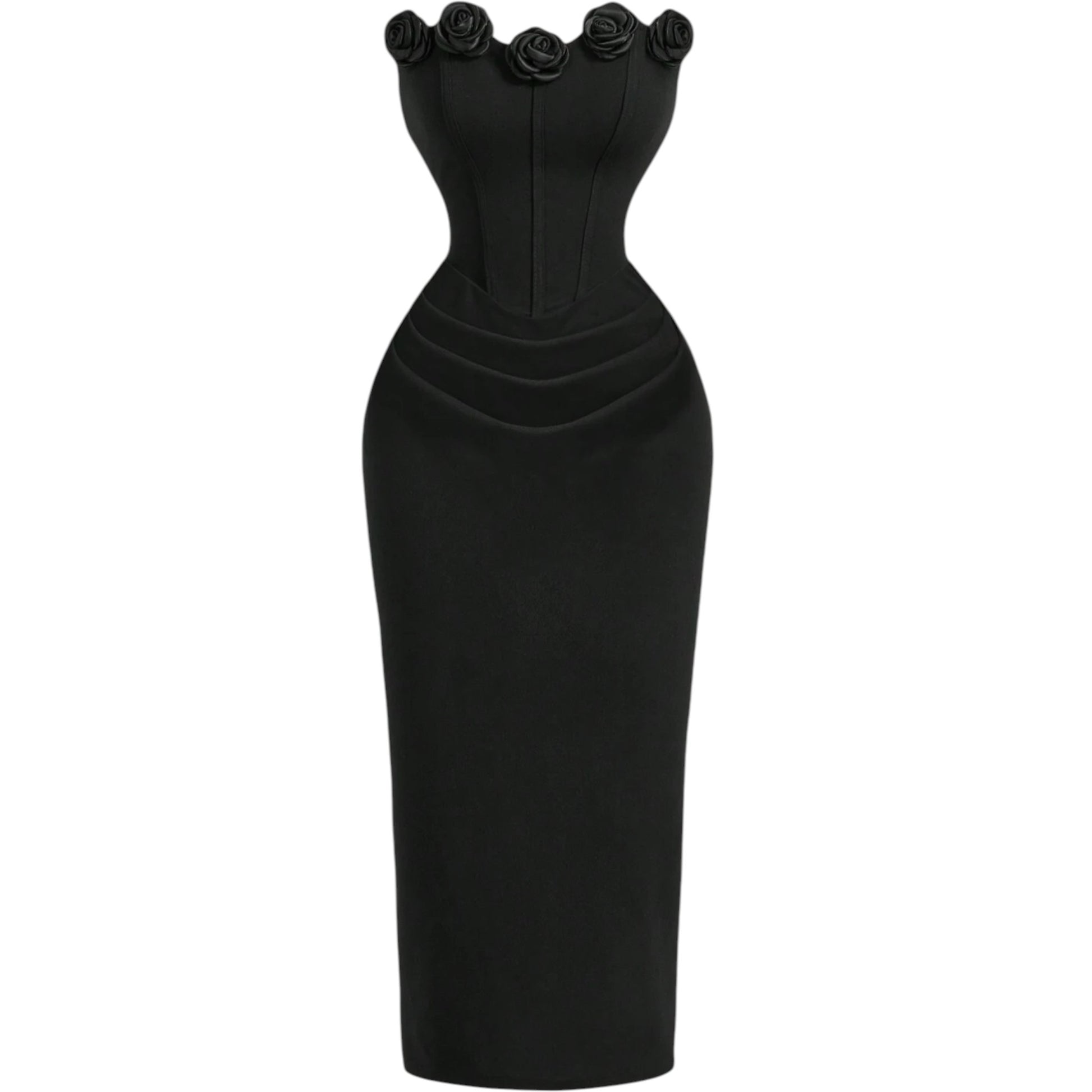 Címke nélküli, fekete, ujjatlan, midi, vállpánt nélküli, mellrészen virágos applikációval.