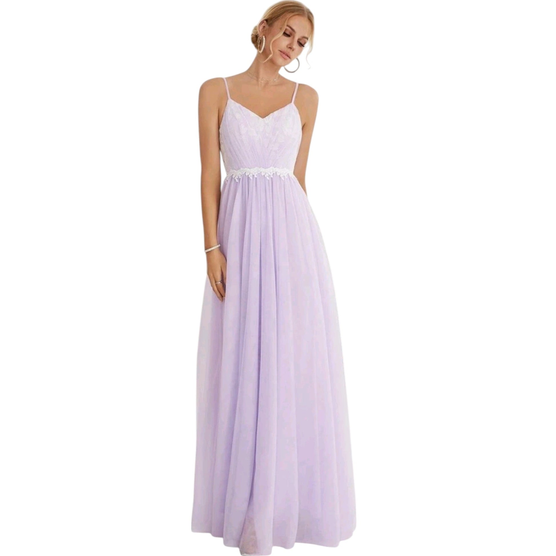 Címke nélküli, lila, vékony pántos, csipkés derékrészű, hosszú alkalmi ruha.