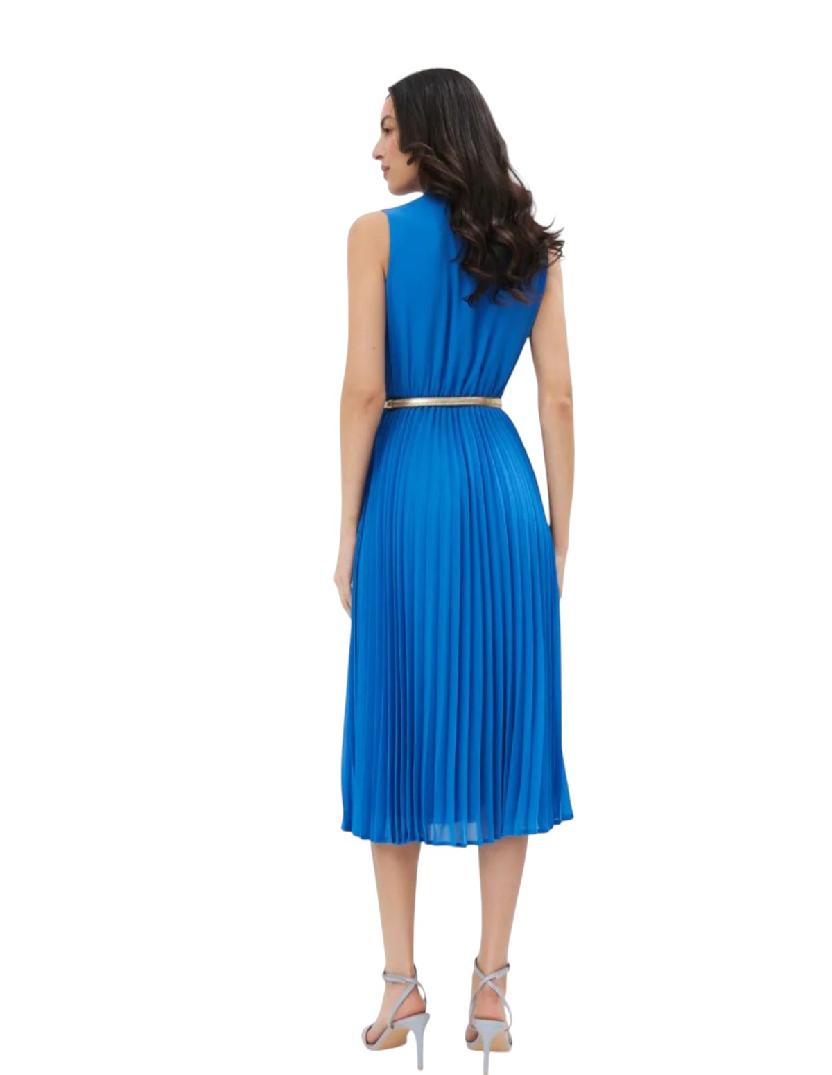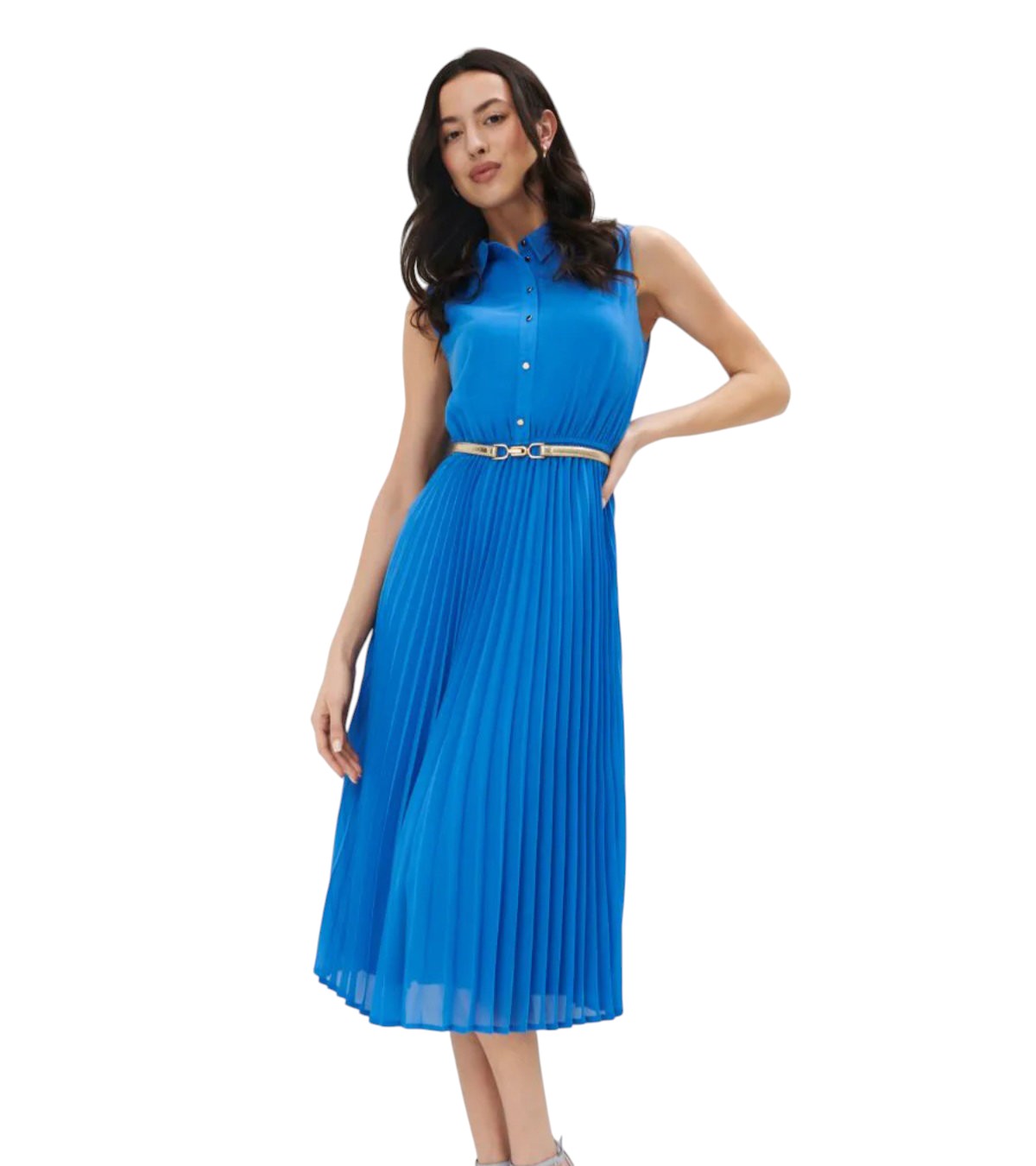 Címke nélküli, kék, ujjatlan, galléros, gombos, öves, pliszírozott midi ingruha