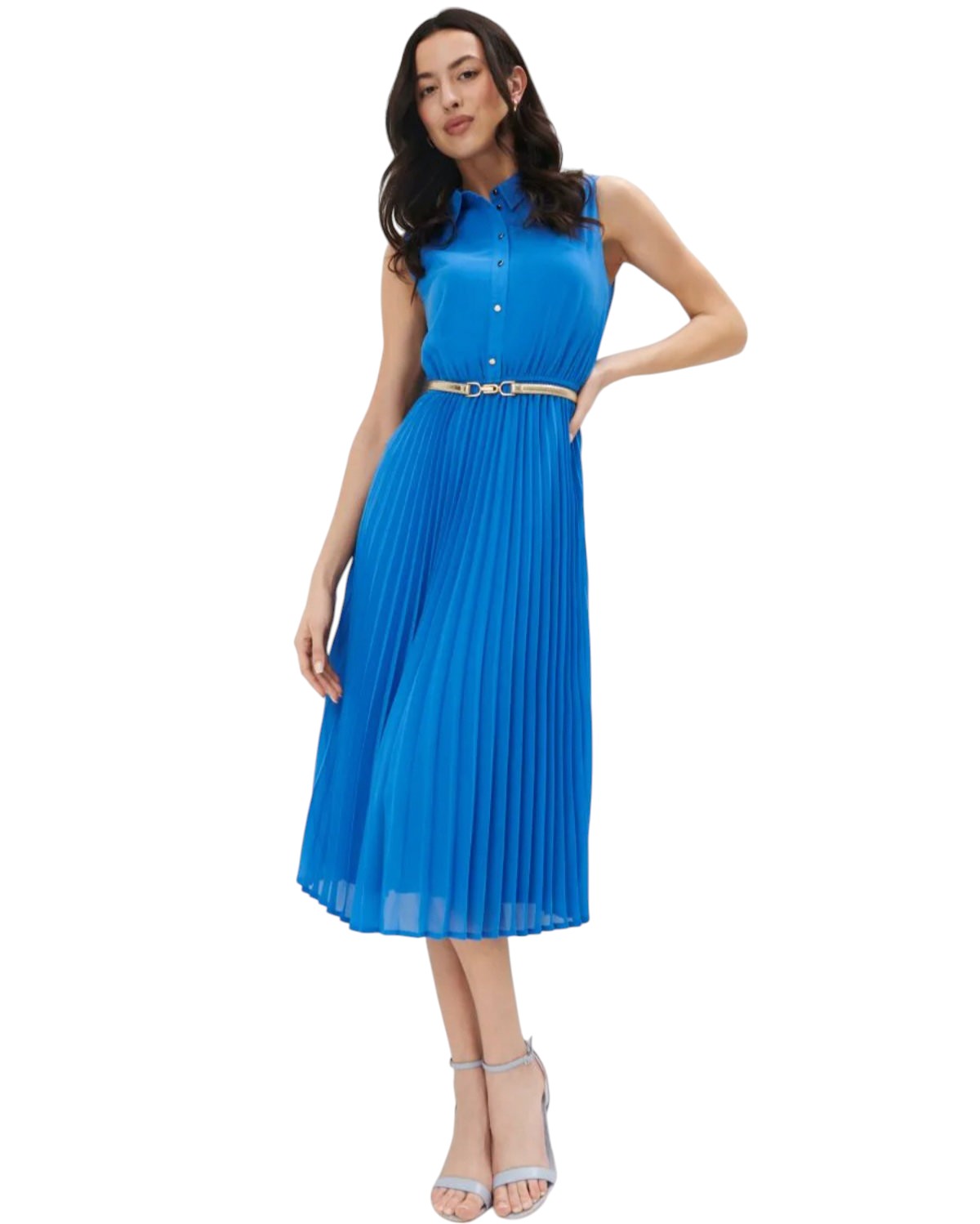 Címke nélküli, kék, ujjatlan, galléros, gombos, öves, pliszírozott midi ingruha