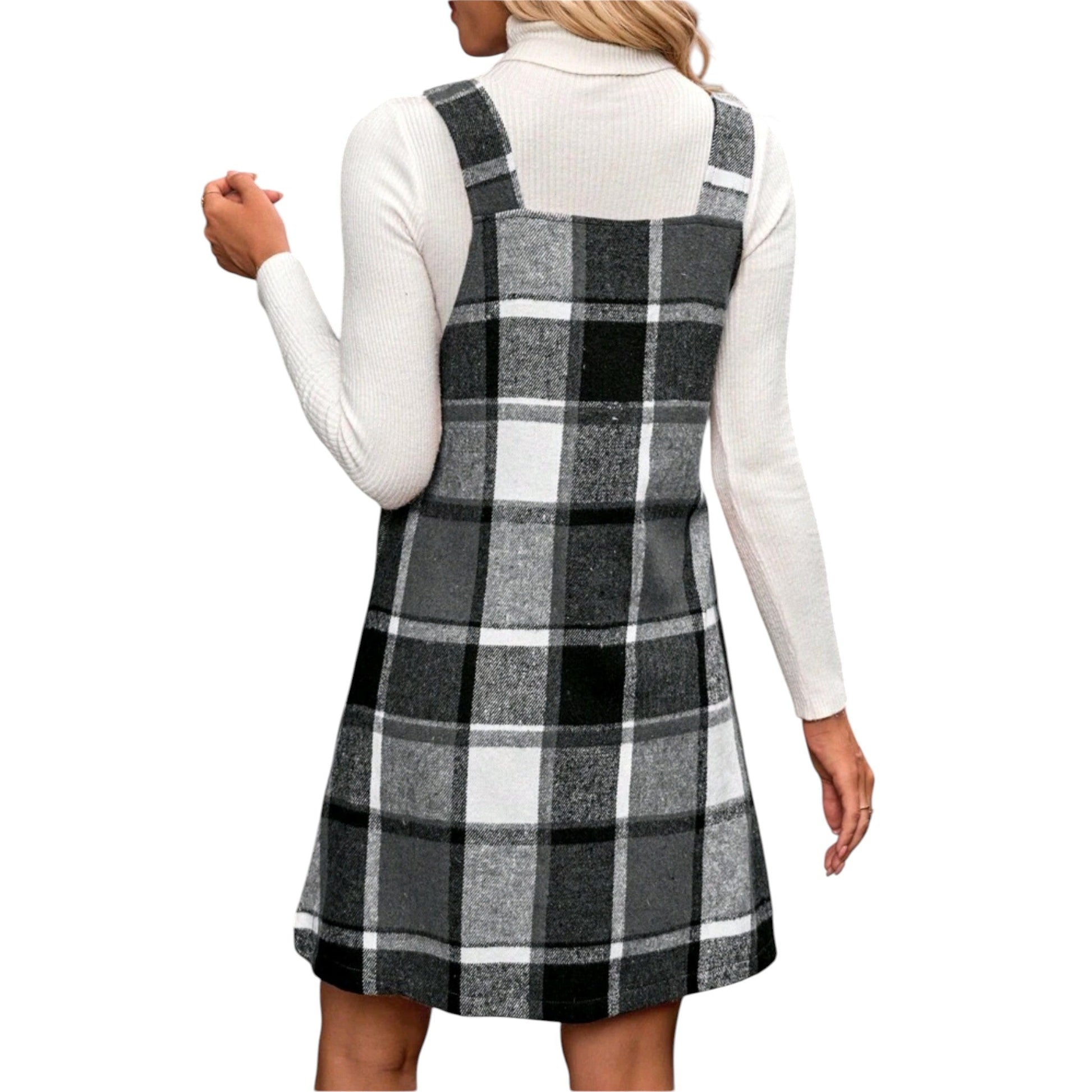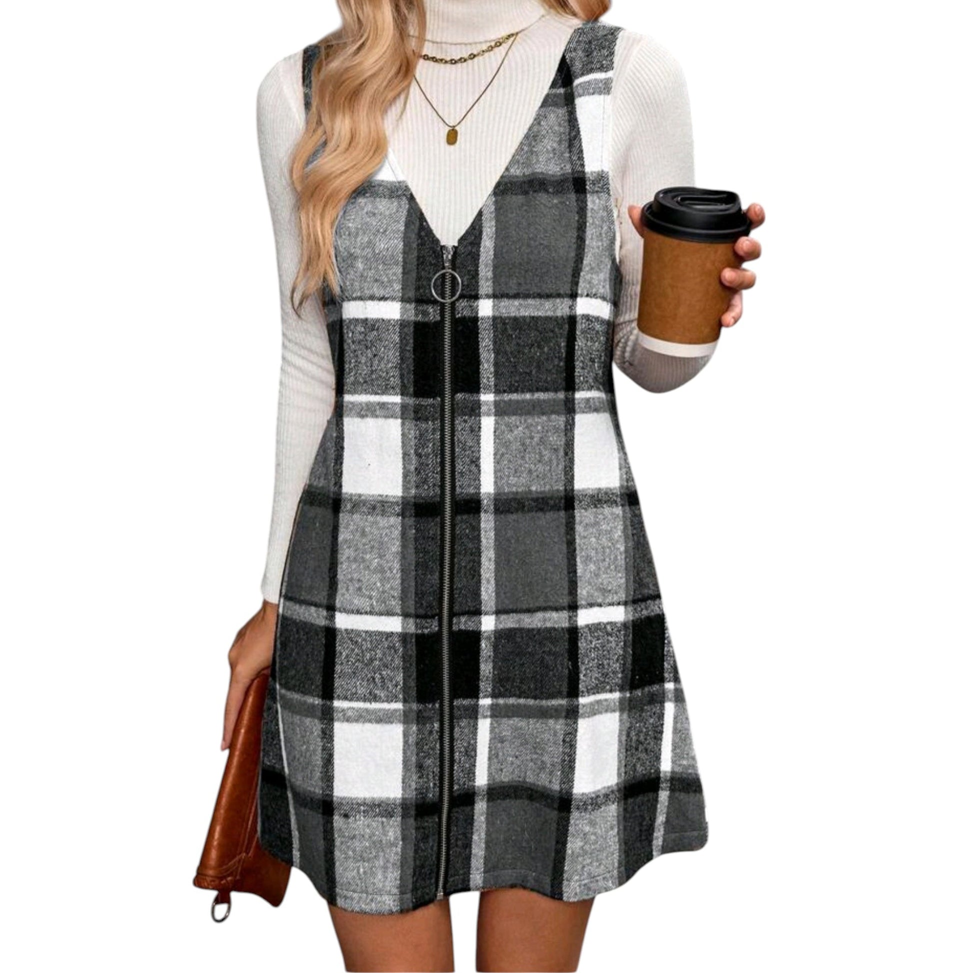 Címke nélküli, fekete és fehér kockás, V-nyakú ruha, cipzáras elejével, hosszú ujjú garbóval viselve.