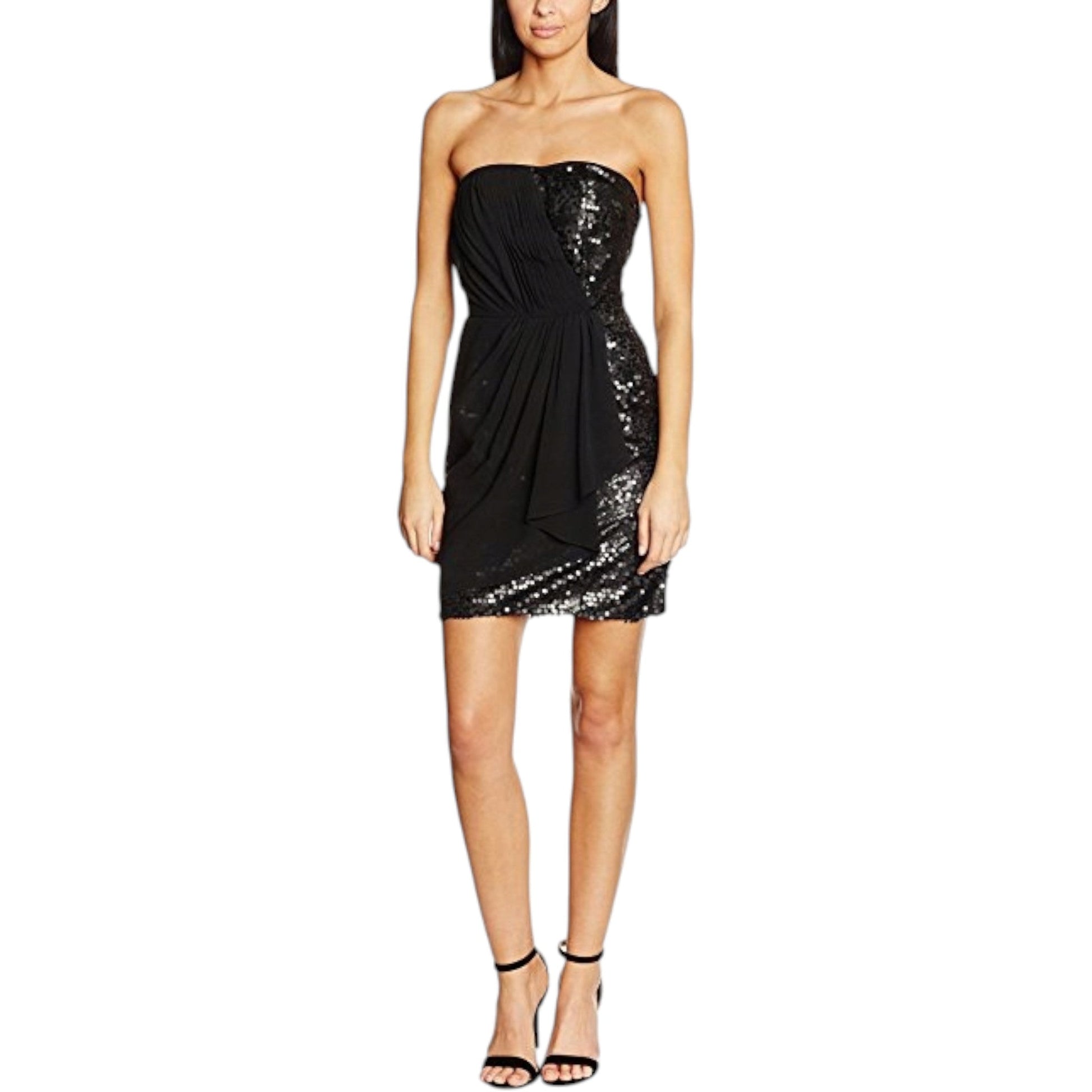 Címke nélküli, fekete, pánt nélküli, flitteres díszítésű, rövid (mini) ruha, mell részen húzott, aszimmetrikus szabású anyagbetéttel.