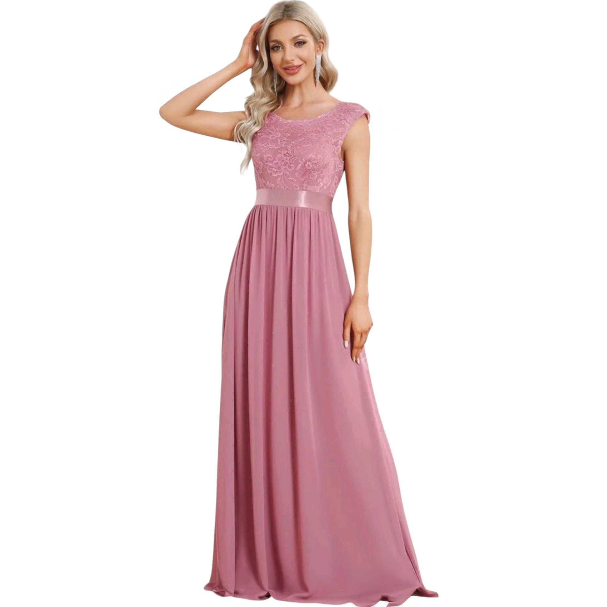 Címke nélküli, mályva, hosszú, ujjatlan, kerek nyakú, csipke felsőrész, szatén öv.