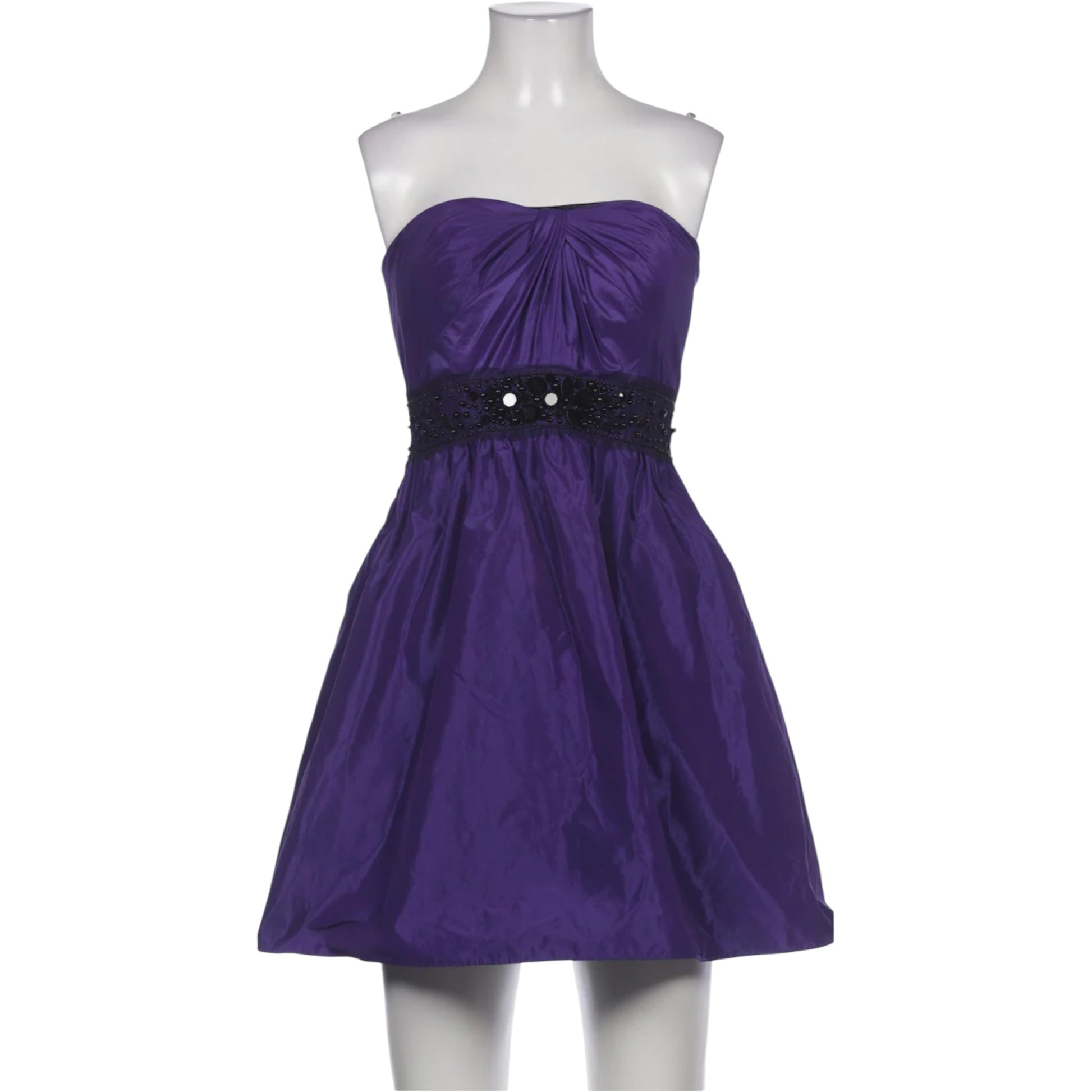 Címke nélküli, lila, pánt nélküli, rövid (mini) ruha, szatén anyagú, enyhén bővülő szoknyarésszel, fekete gyöngyös díszítésű derékrésszel, hátul cipzáros.