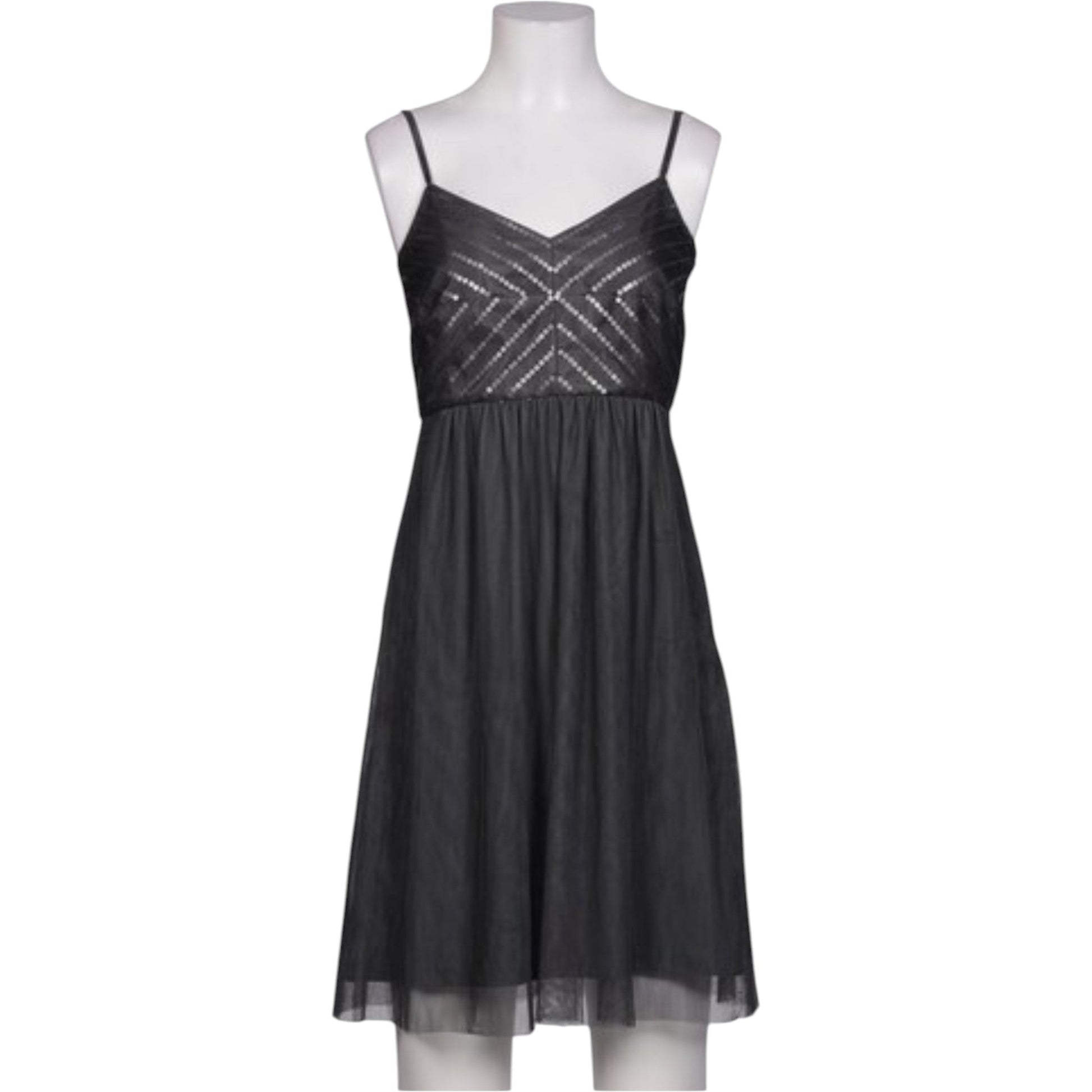 Címke nélküli, fekete, vékony pántos, rövid (mini) ruha, V-nyakkivágással, tüll szoknyarésszel, mell részen átlós mintázatú díszítéssel.