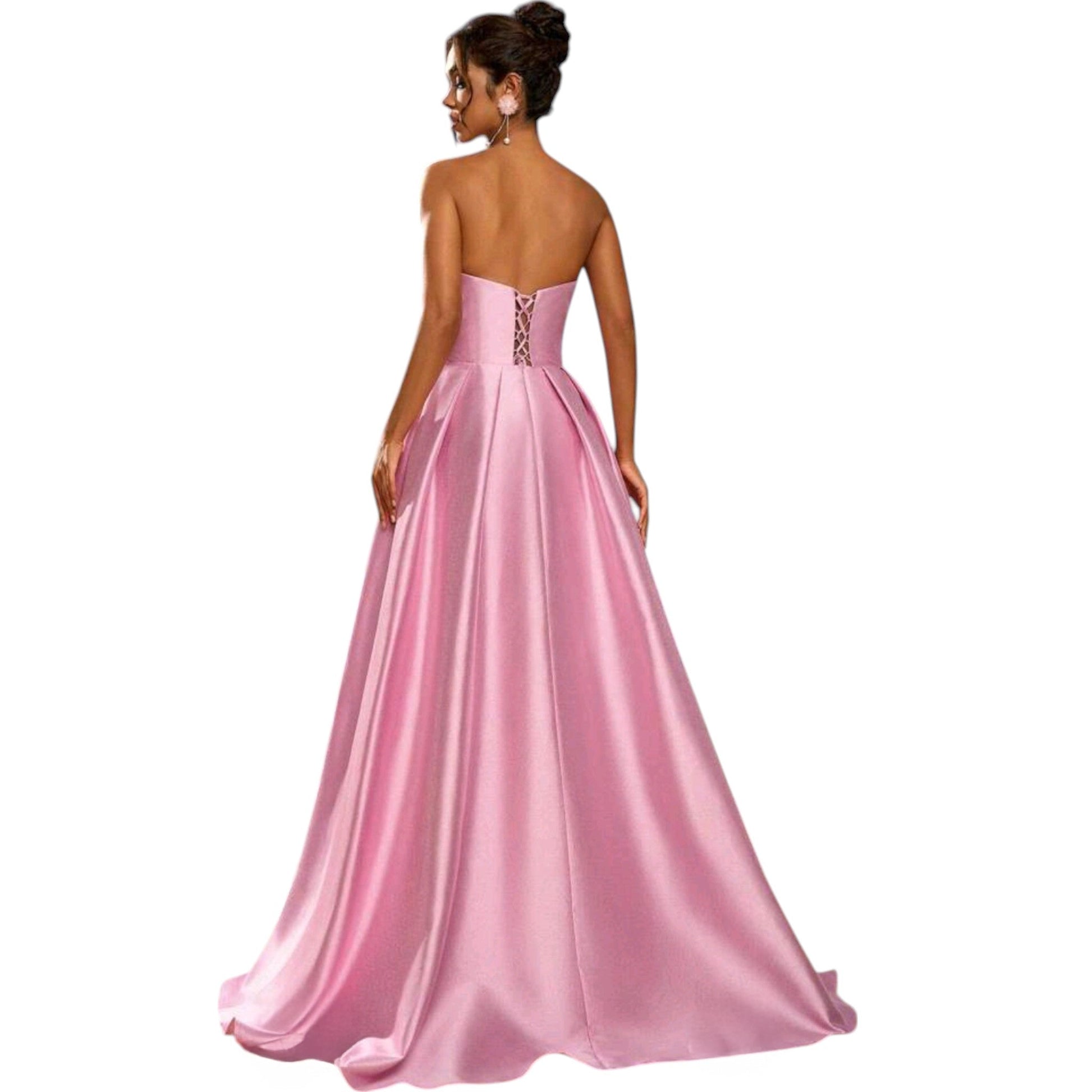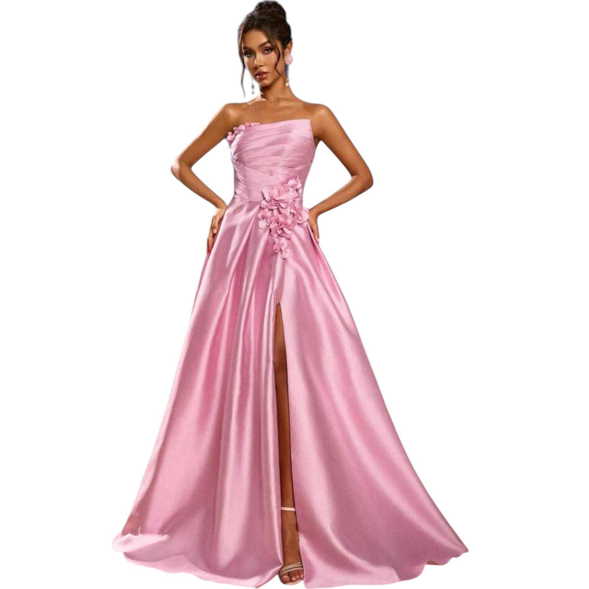 Címke nélküli, rózsaszín, pánt nélküli, virág díszítésű, sliccel ellátott szatén estélyi ruha.