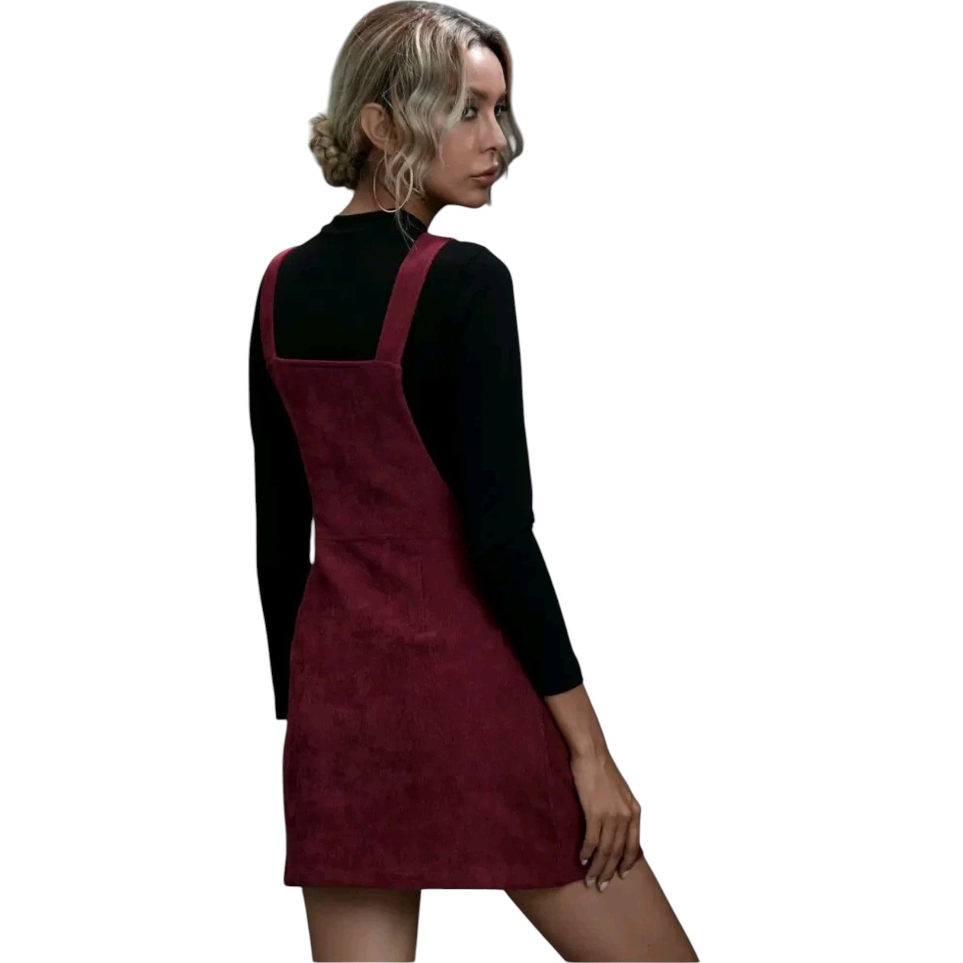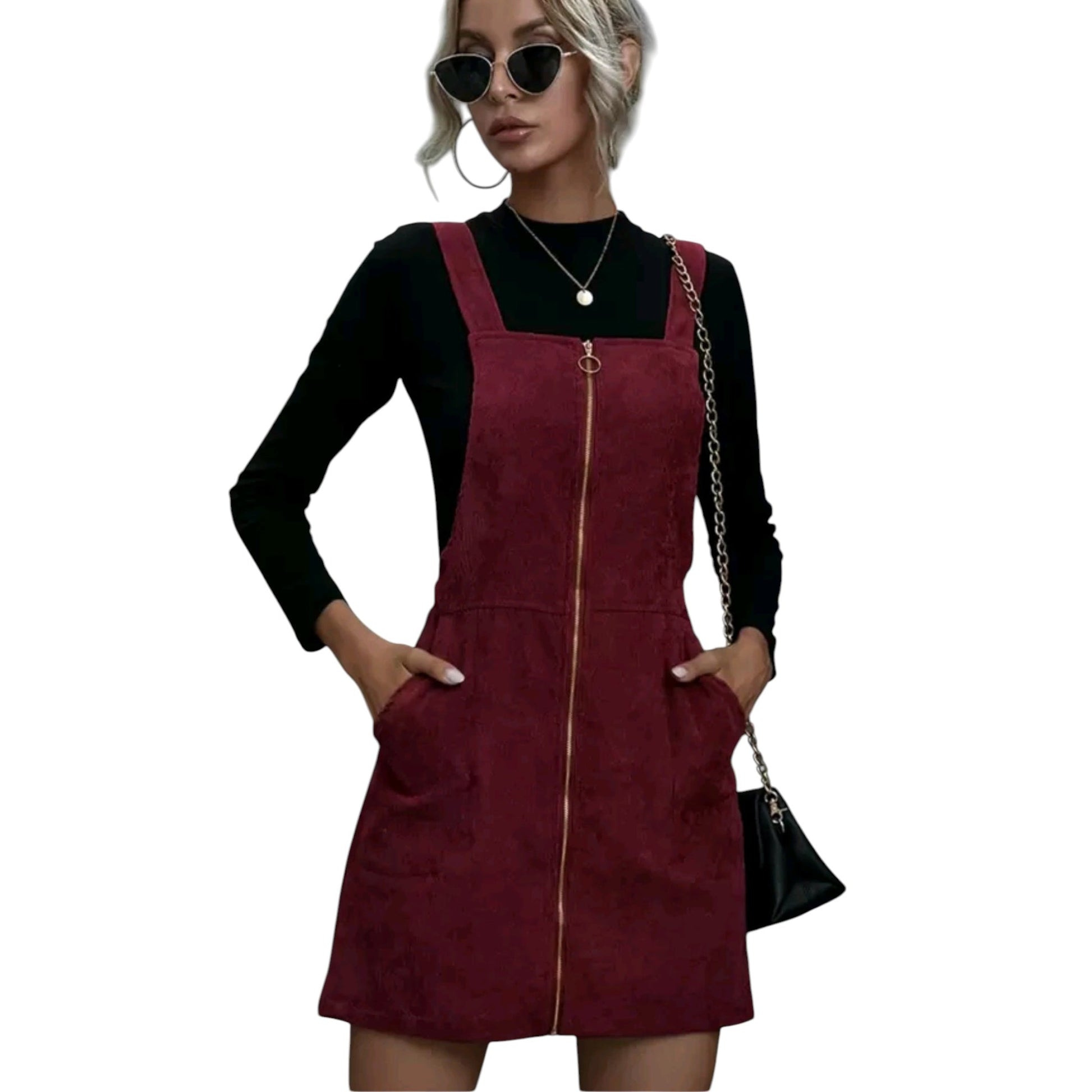 Címke nélküli, bordó, cipzáras, négyzetes nyakú, mini ruha, oldalzsebekkel.