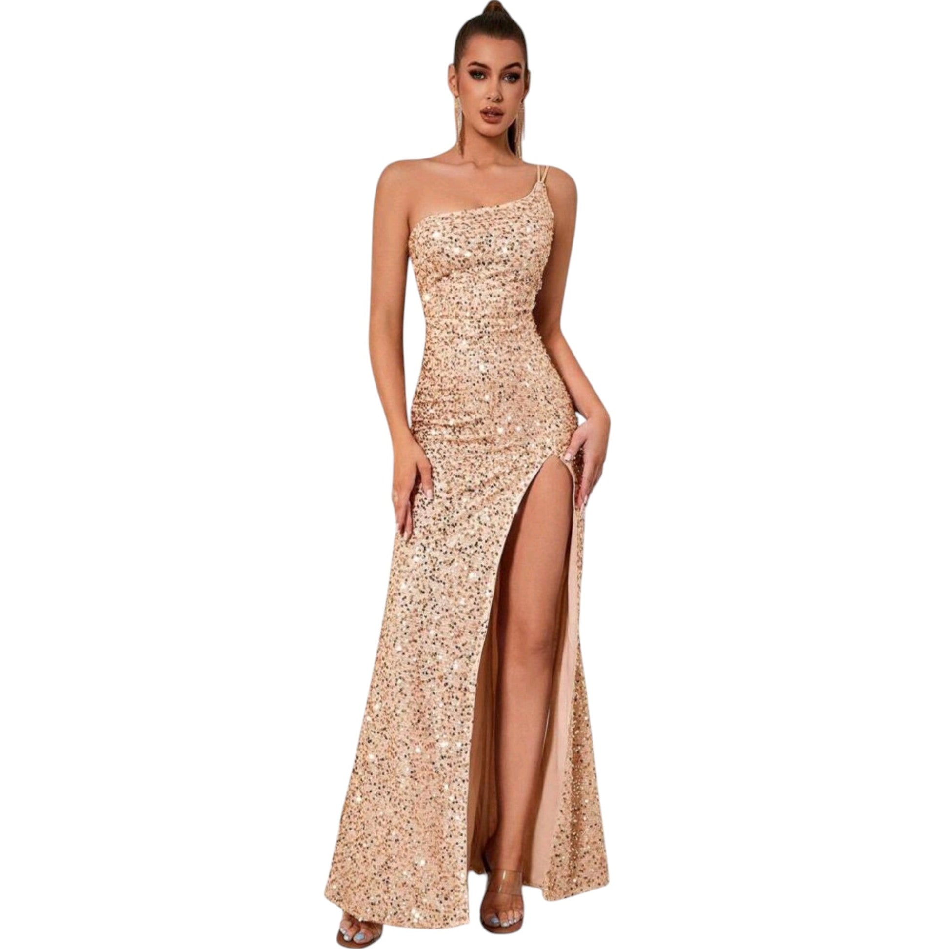 Címke nélküli, arany színű, flitteres, hosszú, félvállas, oldalt sliccelt.