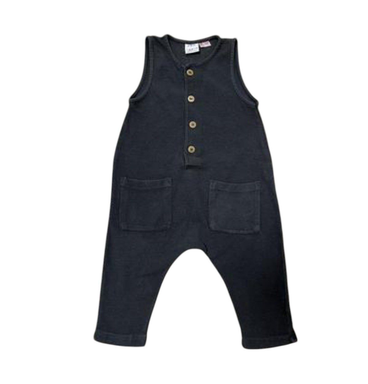 Címke nélküli, sötétkék, pamut, kezeslábas, kerek nyakkivágás, ujjatlan, gombsor elöl, zsebek.