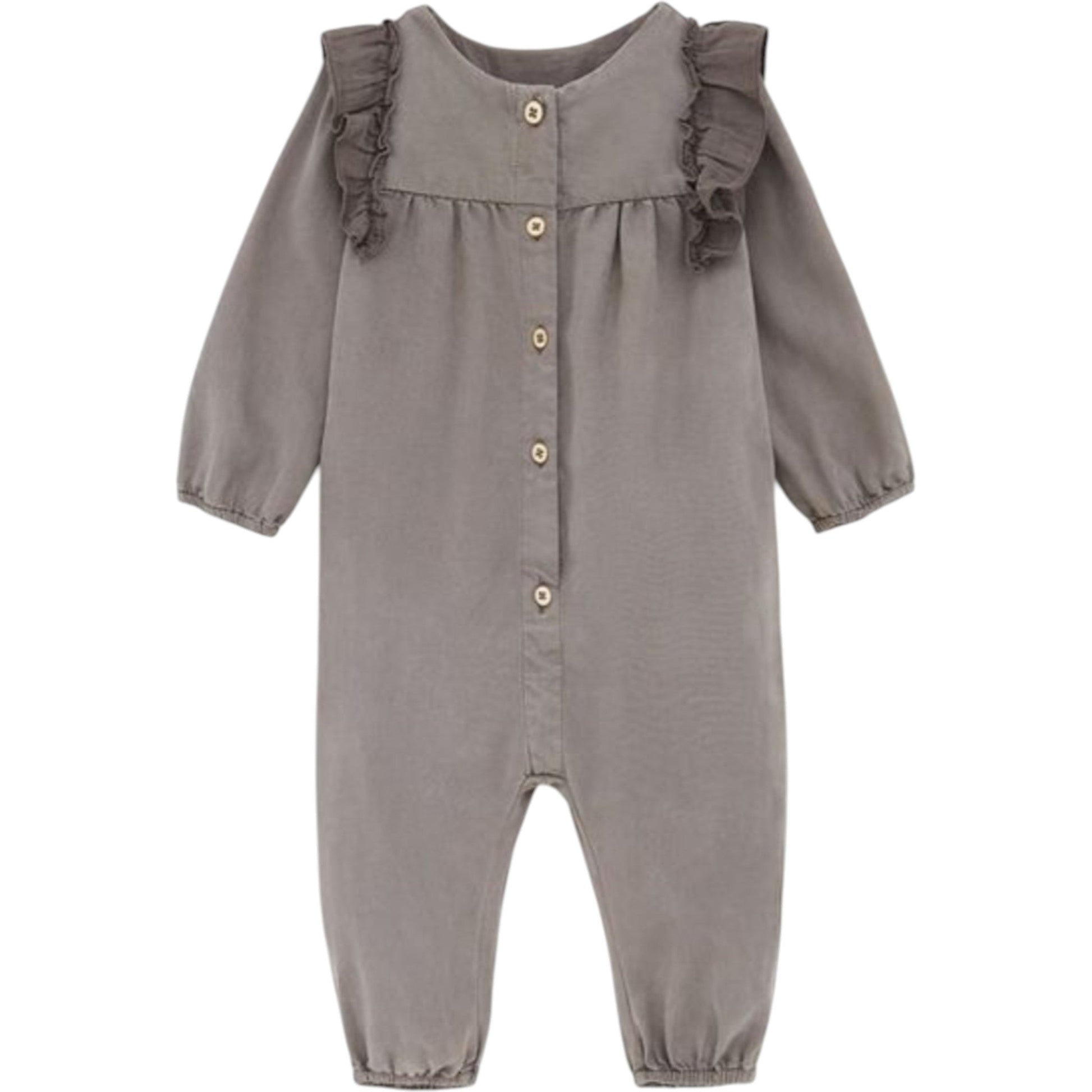 Címke nélküli, szürke, hosszú ujjú, vállán fodros díszítéssel, elöl gombos záródással, ujján és alján passzéval ellátott, puha kezeslábas.