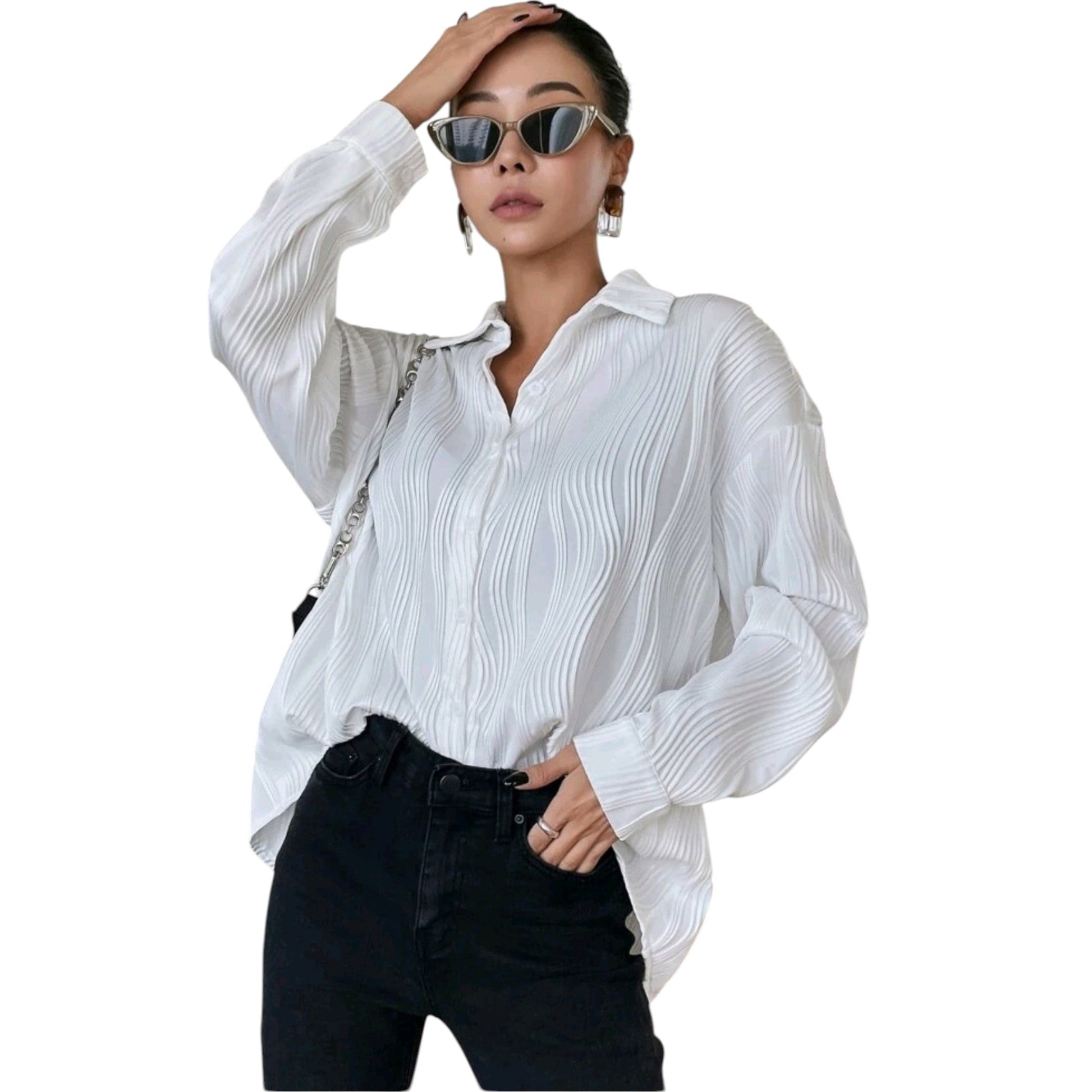 Címke nélküli, fehér, galléros, hosszú ujjú, gombos, hullámos textúrájú.